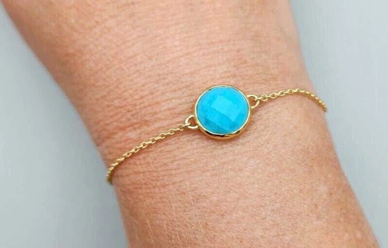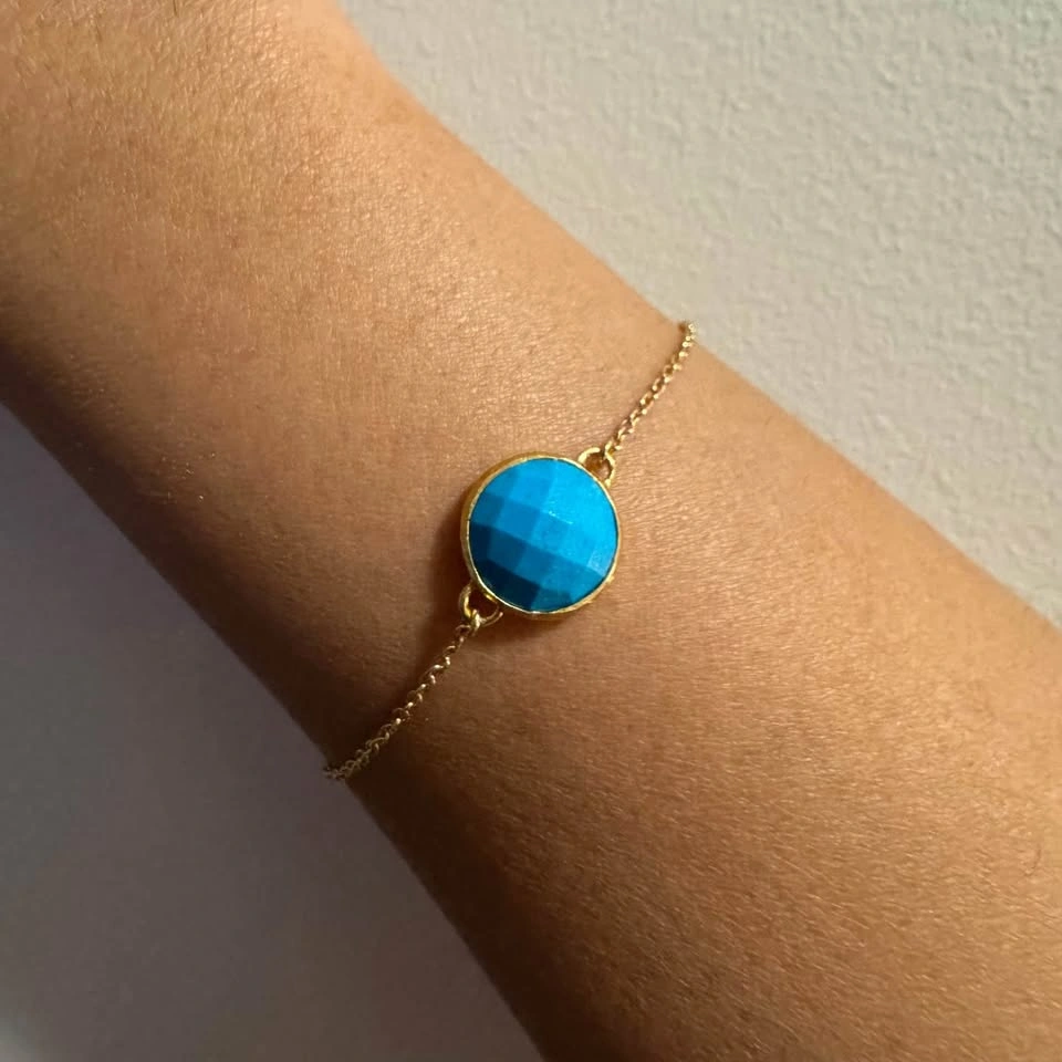 Elegant gold chain bracelet featuring a vibrant blue faceted turquoise coloured stone that reminds me of cystal clear blue waters ππ©΅. Perfect for adding a pop of color to your outfit. Good used condition. Please see photos and let me know if you have any questions.