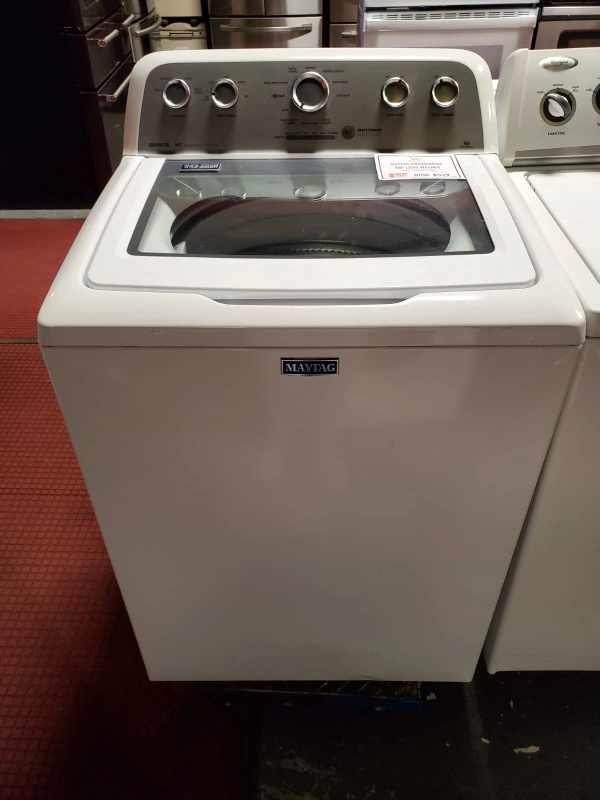 Selling a Maytag Bravos MCT top load washer in white. It looks to be in good condition and ready for a new home!