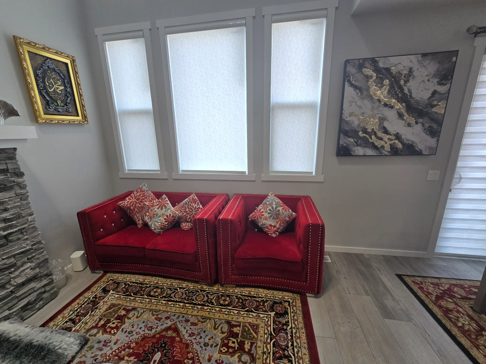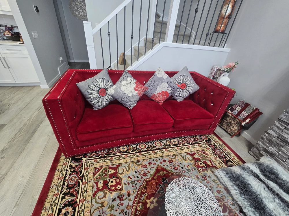 Selling a lovely red velvet sofa set. It's in great condition and would look amazing in any living room! The set includes a sofa and a matching loveseat, both featuring a unique button-tufted design. The material is soft and comfortable, perfect for relaxing after a long day