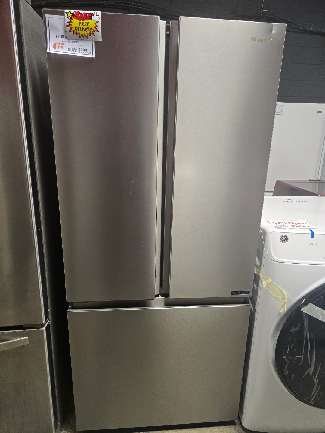 Selling a Hisense French door refrigerator in stainless steel finish. It's in great condition and ready to keep your groceries fresh!