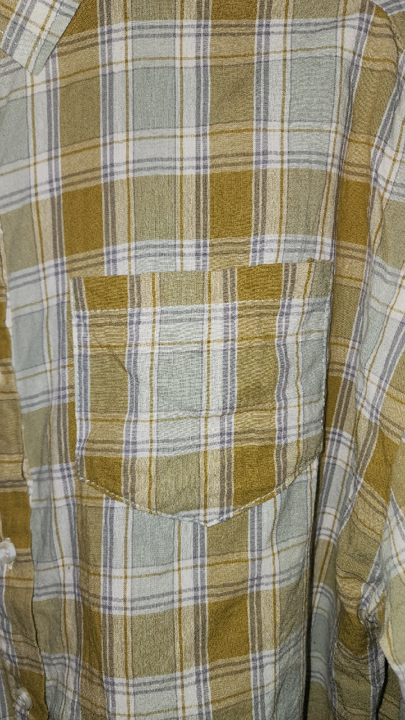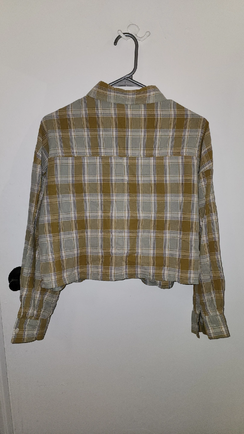 Selling a cute plaid crop top! It's in great condition and features a classic plaid pattern in shades of green, yellow, and white. Perfect for adding a touch of vintage style to your wardrobe