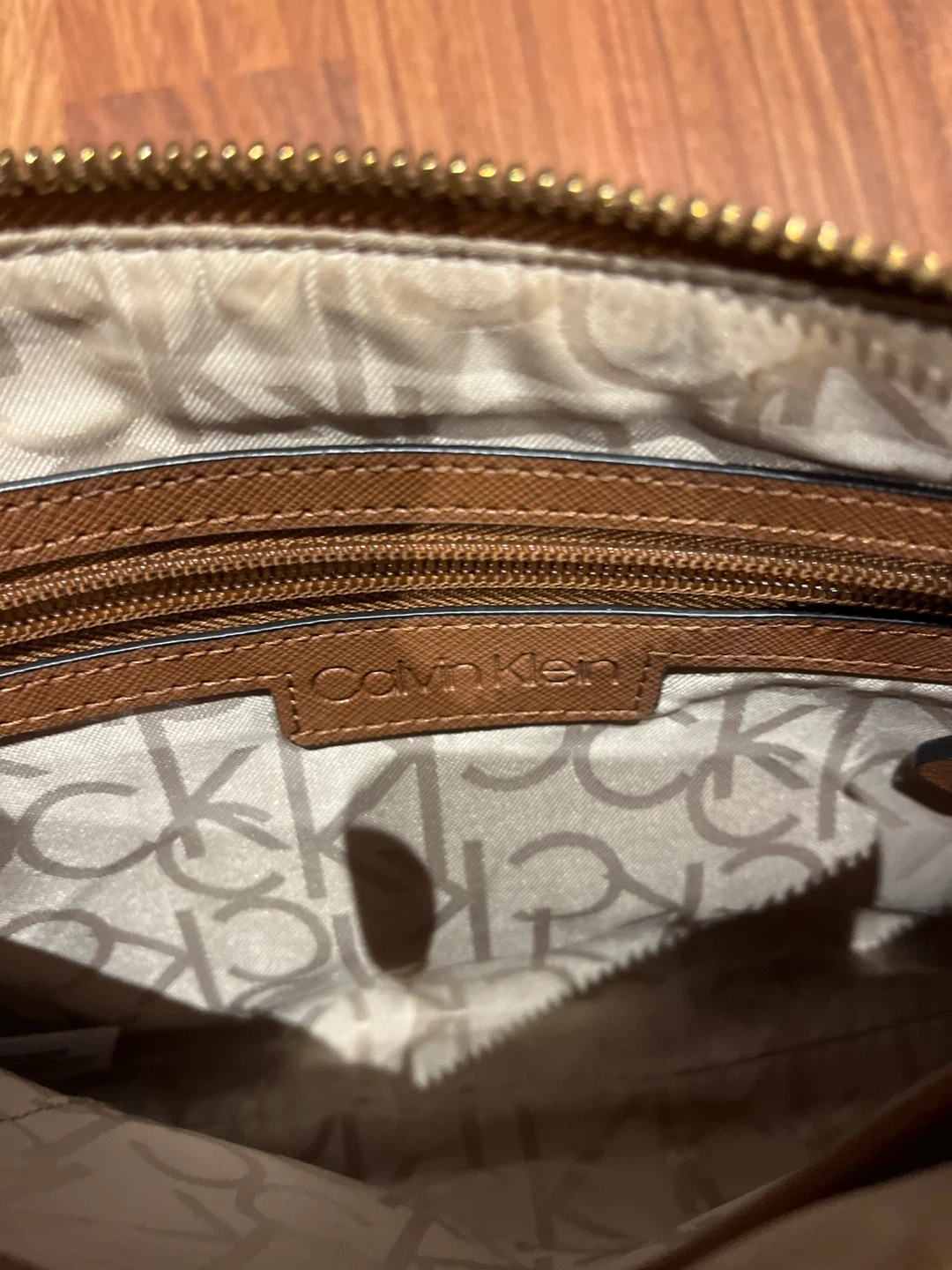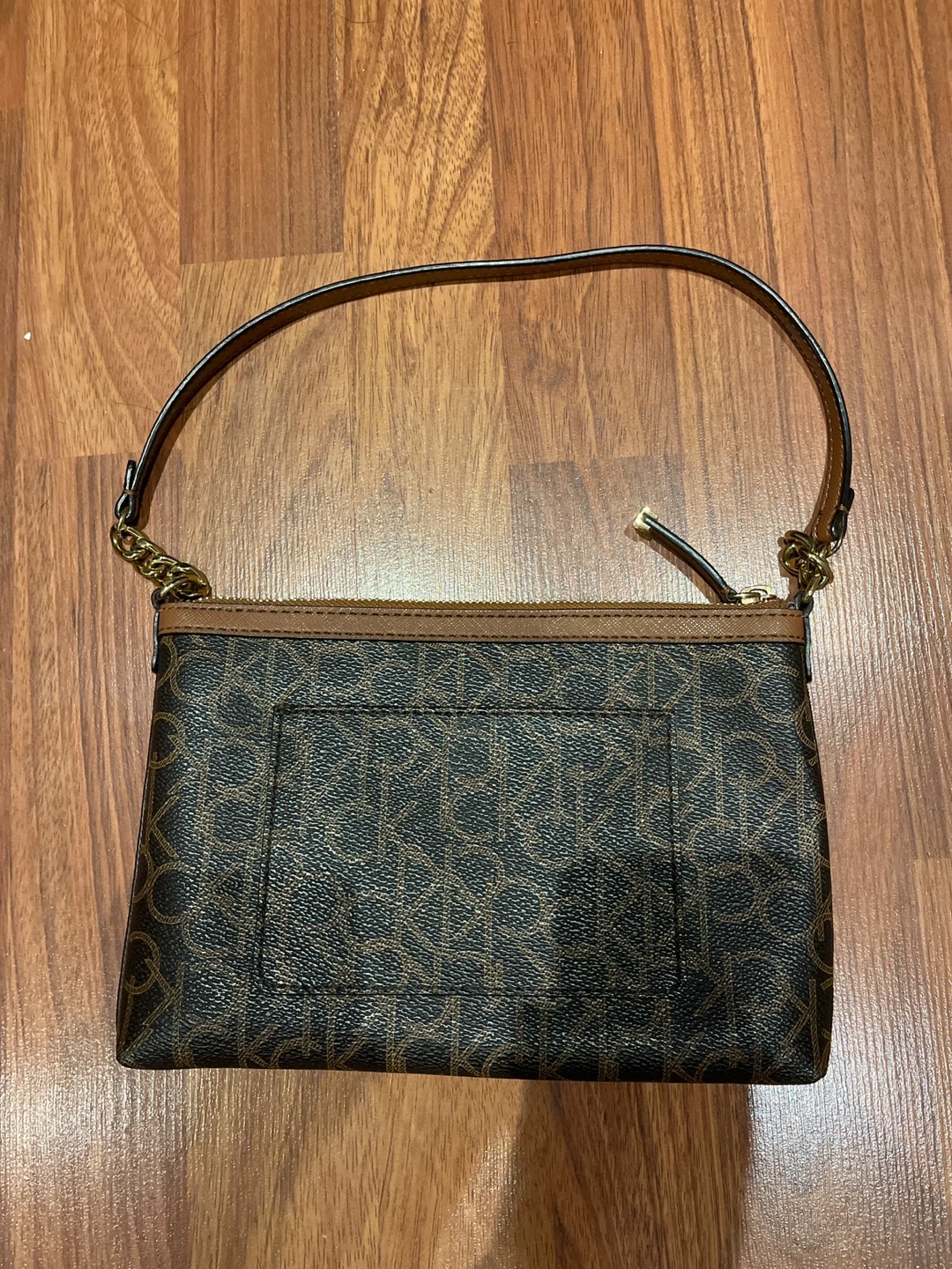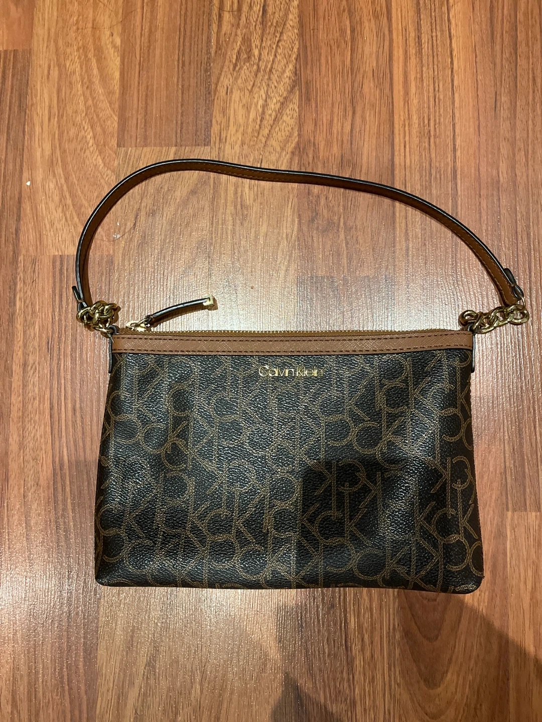 Selling a Calvin Klein shoulder bag with a brown monogram pattern. It's in great condition and perfect for everyday use. The interior is clean and the bag has a stylish, compact design. Meet up or pickup - message if interested