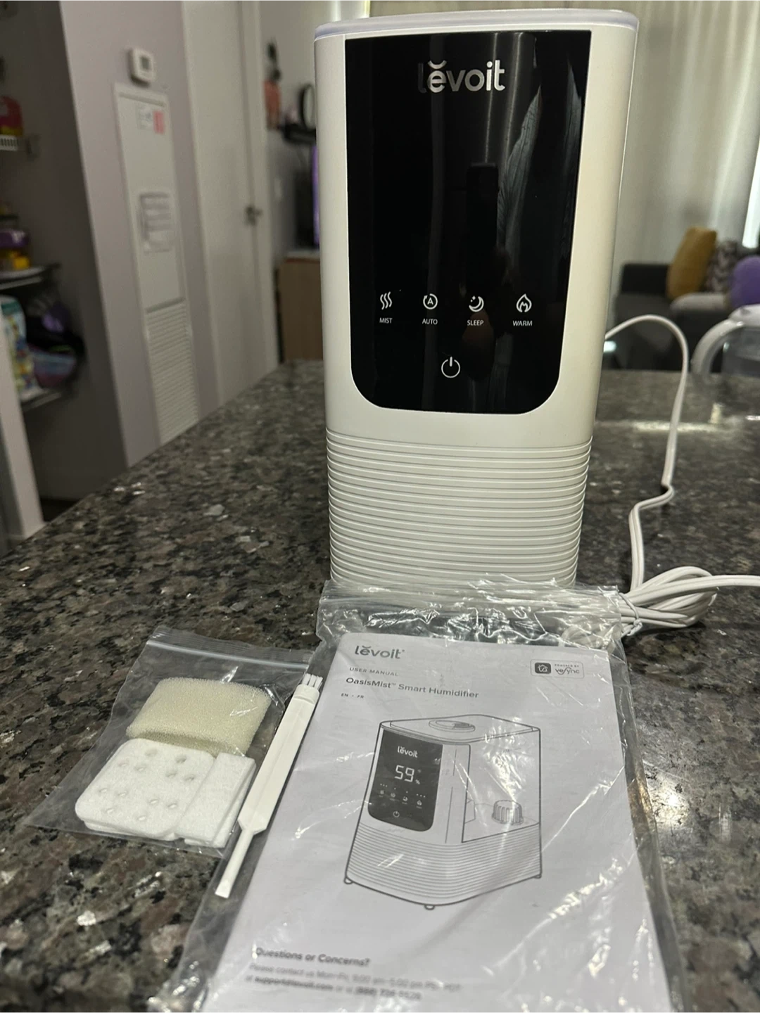 Selling a Levoit OasisMist Smart Humidifier! It comes with the user manual, cleaning brush, and filter pads. The humidifier has mist, auto, sleep, and warm settings. Great for keeping the air comfortable in your home!