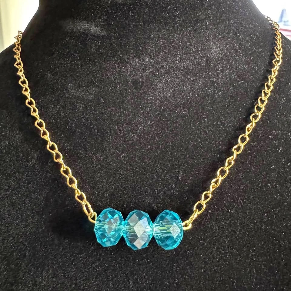 This minimalist chain with a unique bar pendant with aqua blue faceted crystal beads is a simple yet elegant piece of jewelry that will enhance any outfit. Stunning blue crystals that remind me of the seaside in summer—beautiful mermaidcore vibes! Beautifully handcrafted and repurposed from broken vintage jewelry. This piece would also make a beautiful gift for Christmas, Valentine’s Day, Mother’s Day or for a loved one’s birthday. Please see photos and let me know if you require further information.