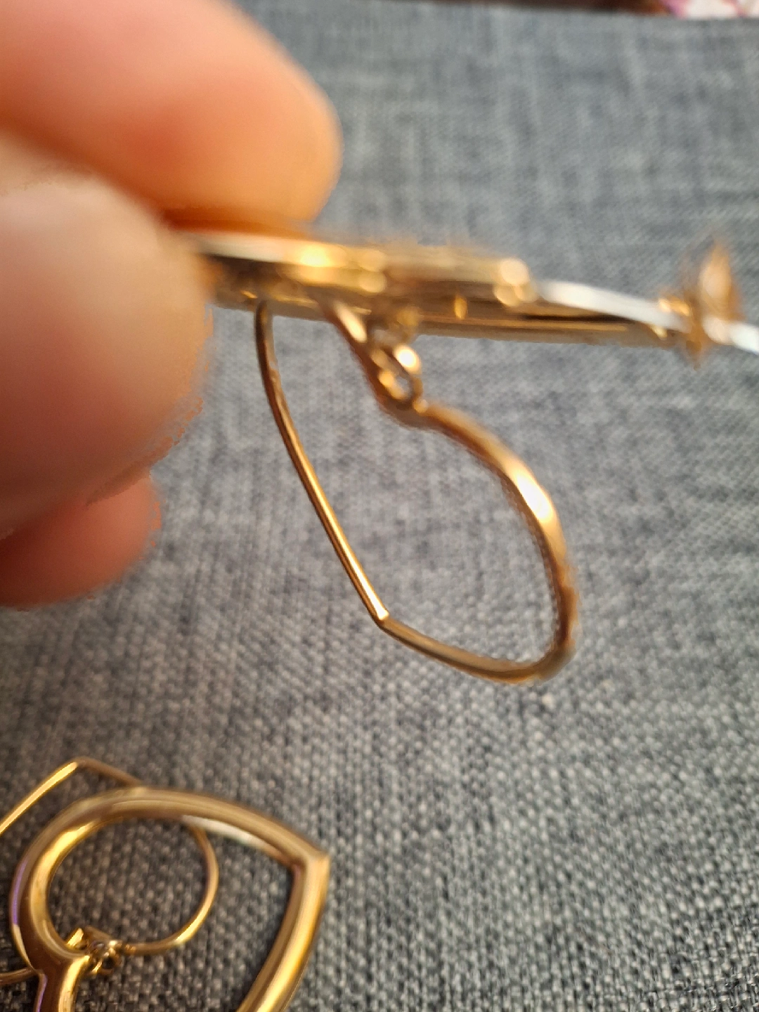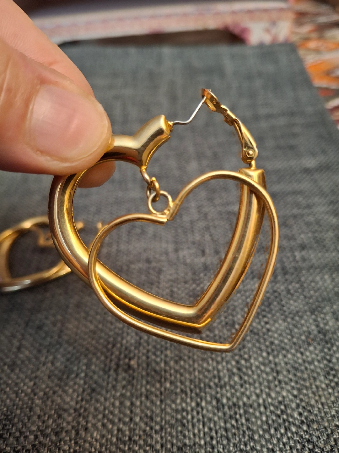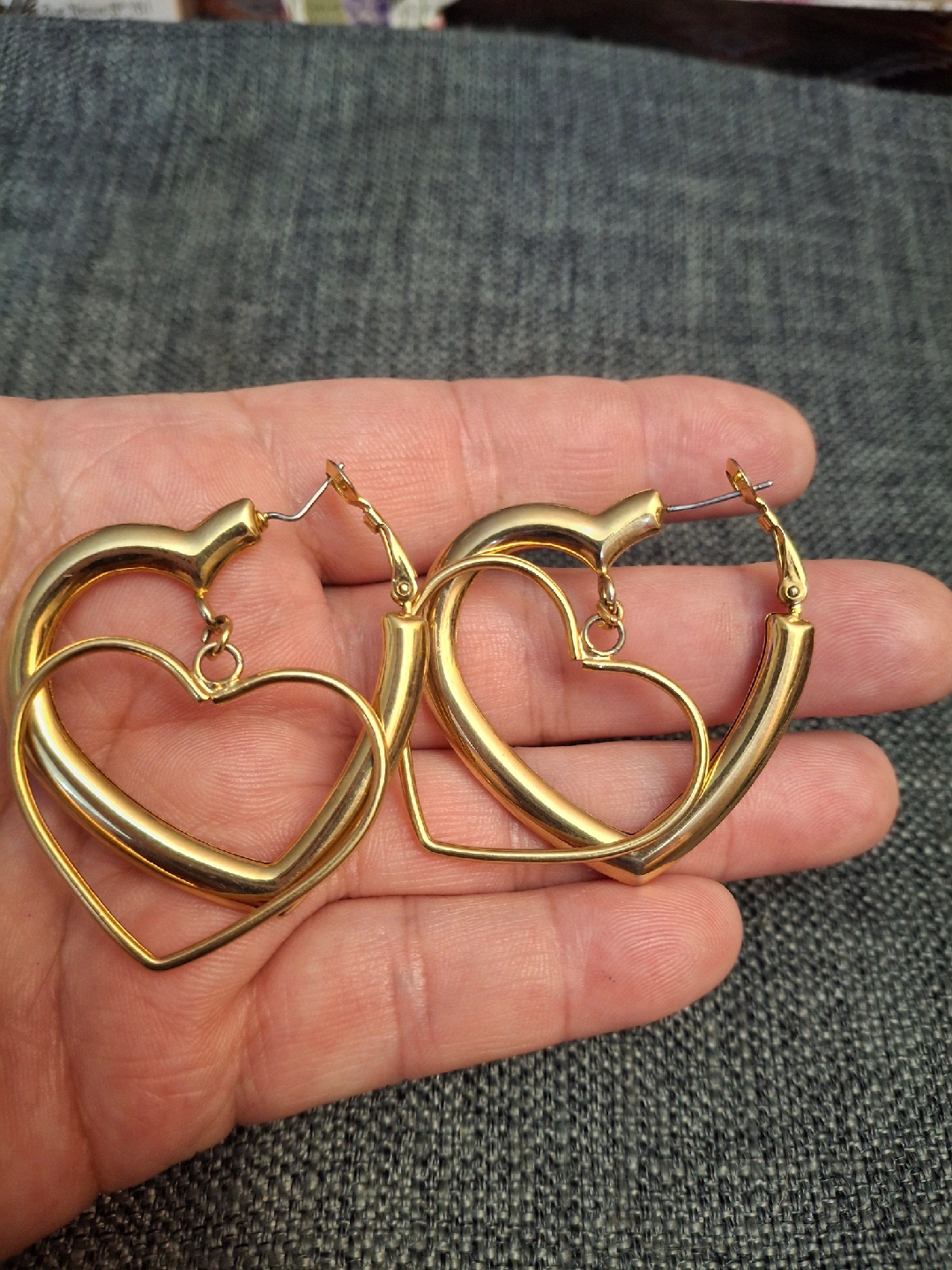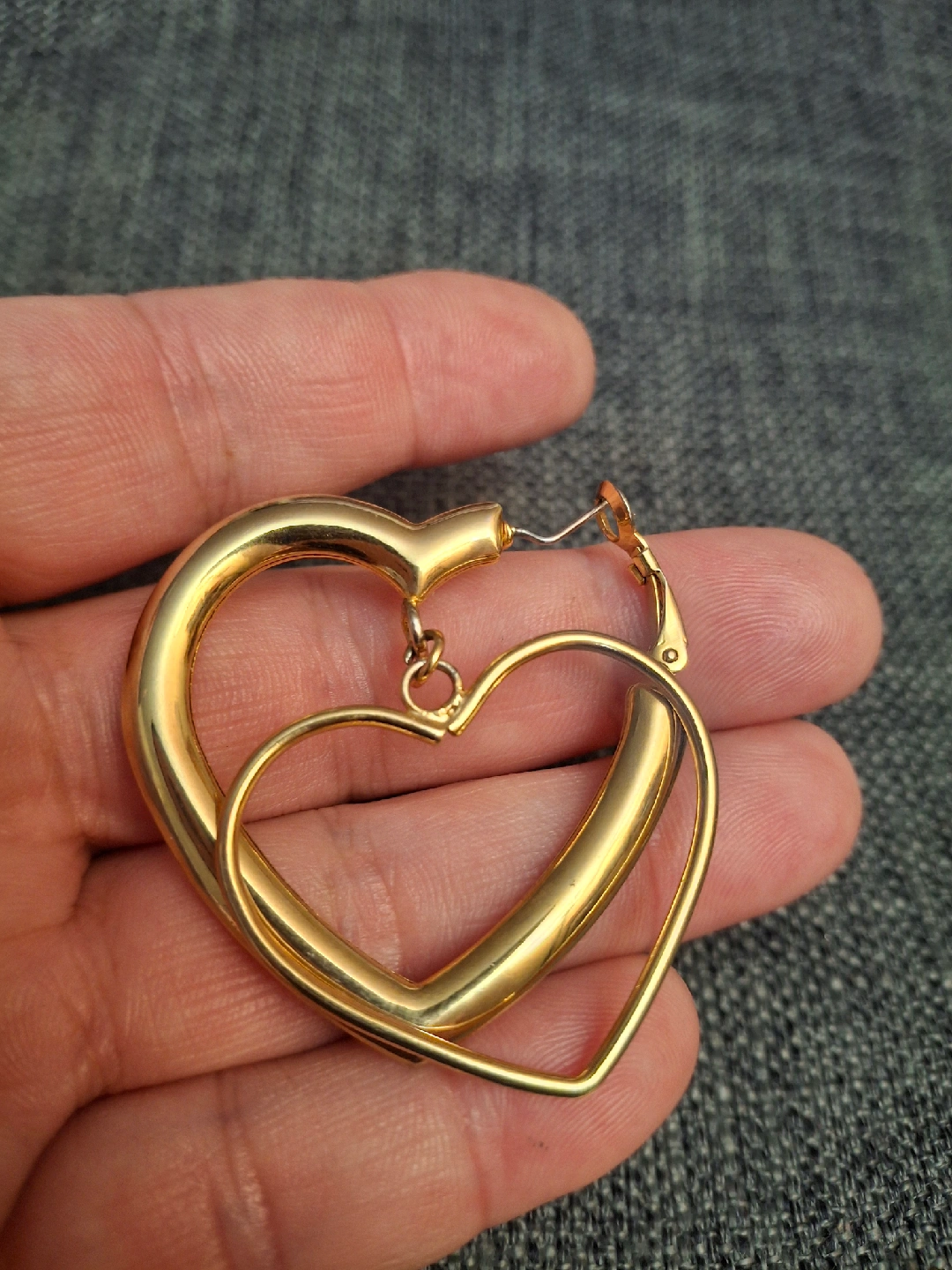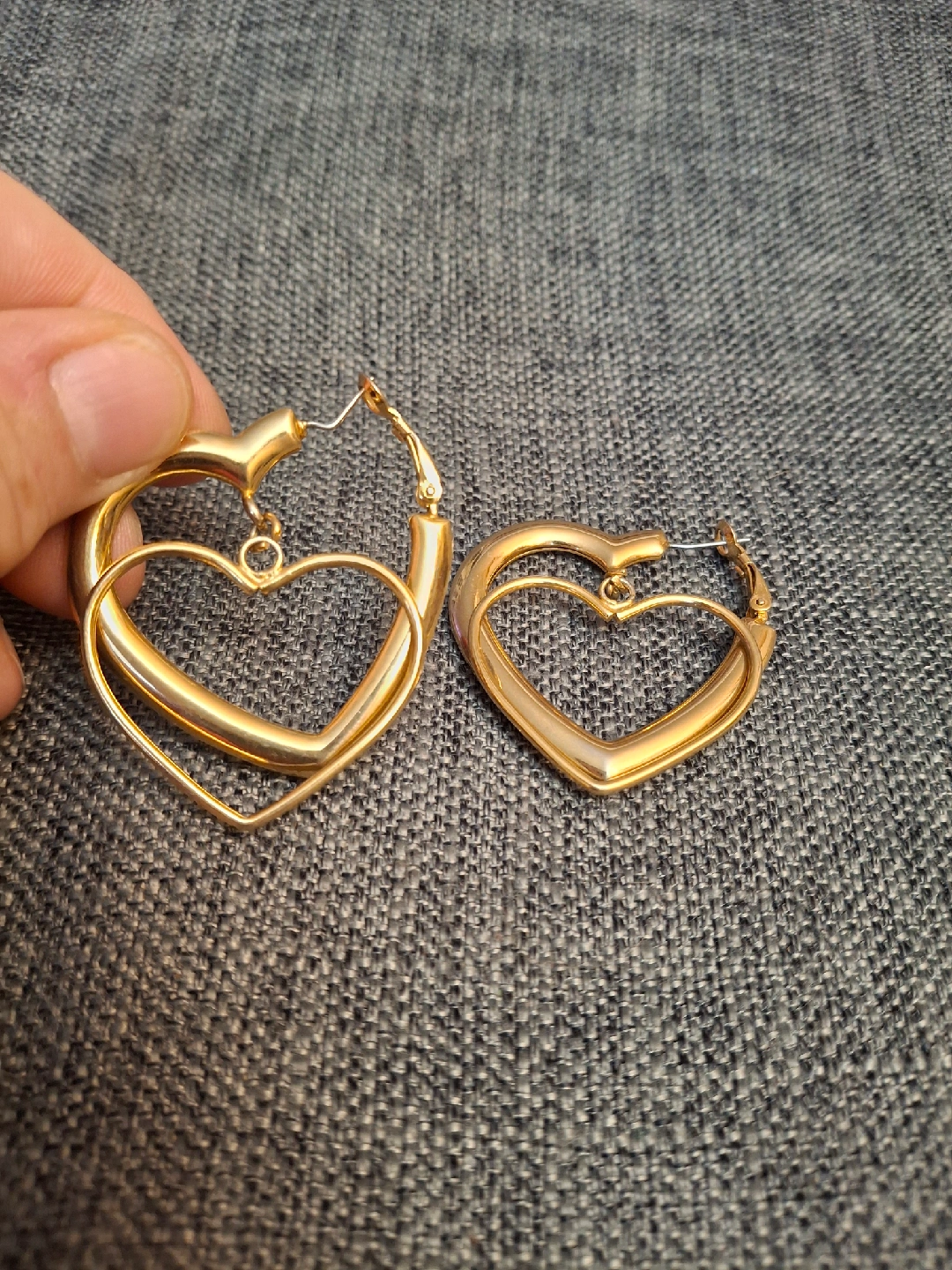 Selling a pair of gold heart hoop earrings! They're in great condition and would be a cute addition to any outfit