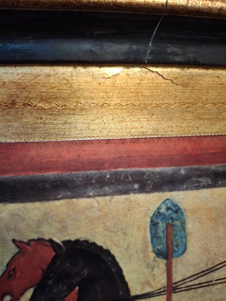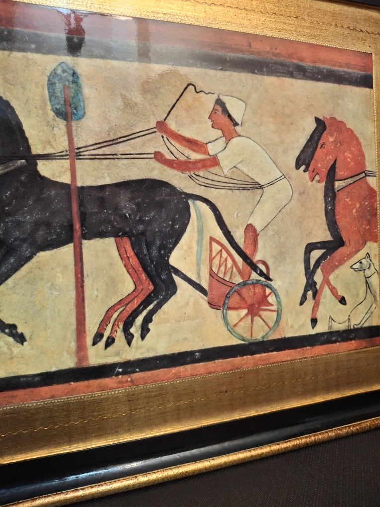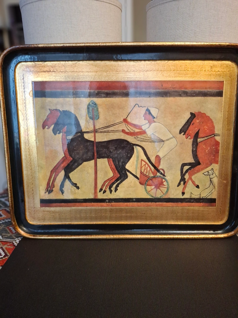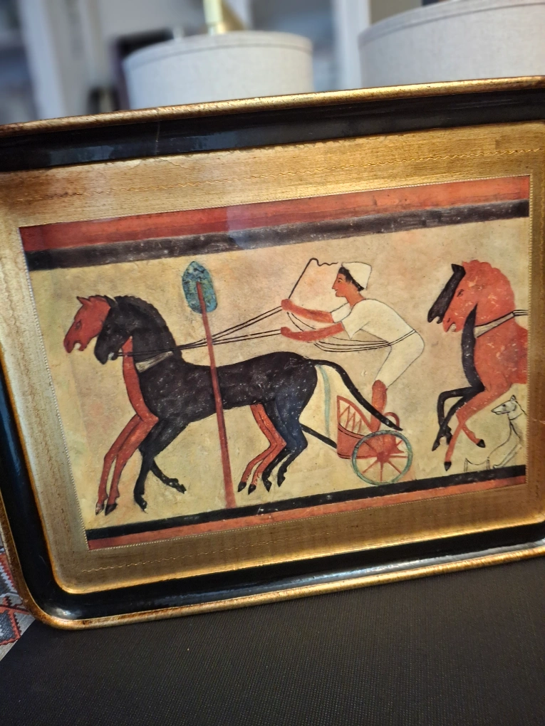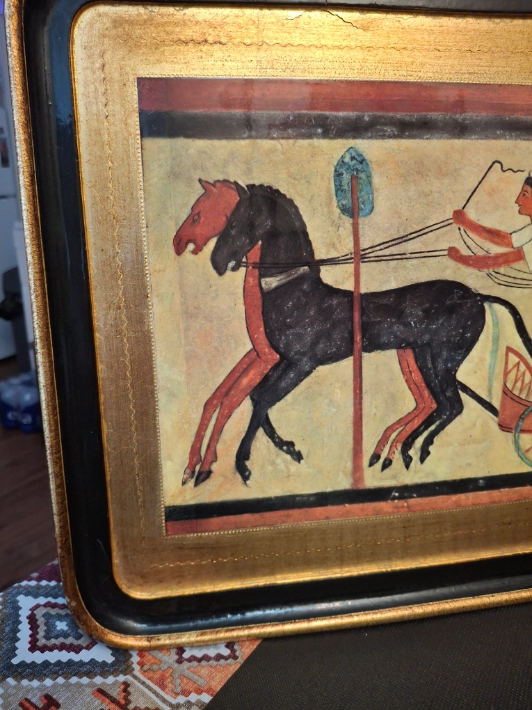 Wooden Tray depicting an Egyptian chariot scene. The frame is gold and black. It's a unique piece that could add a touch of history to your home