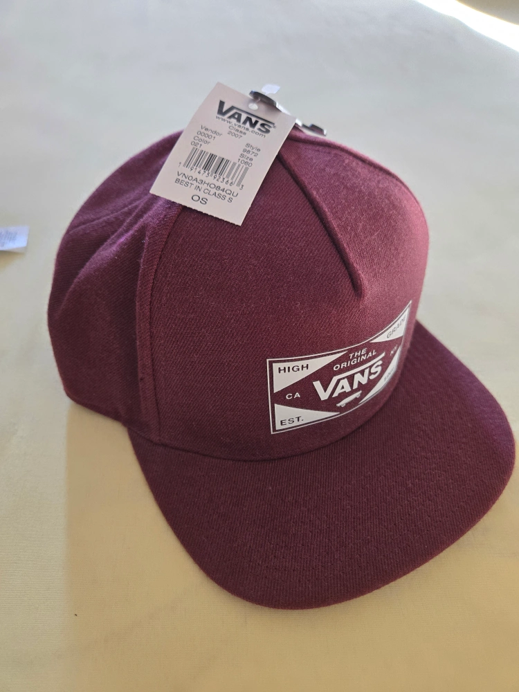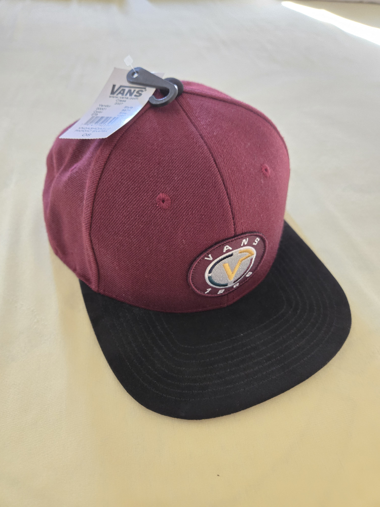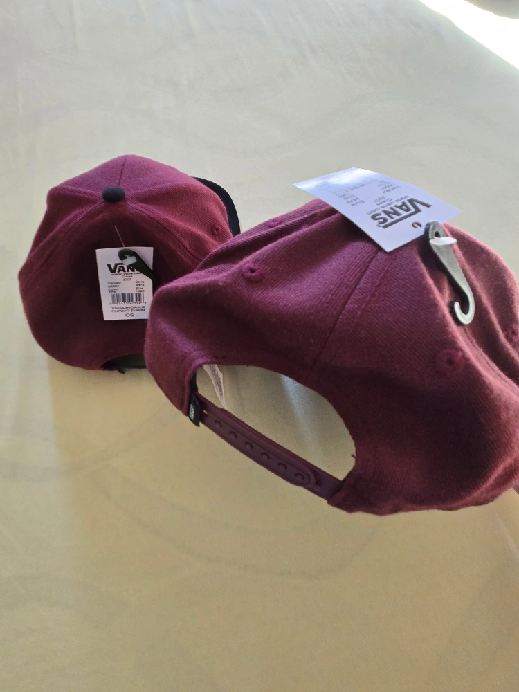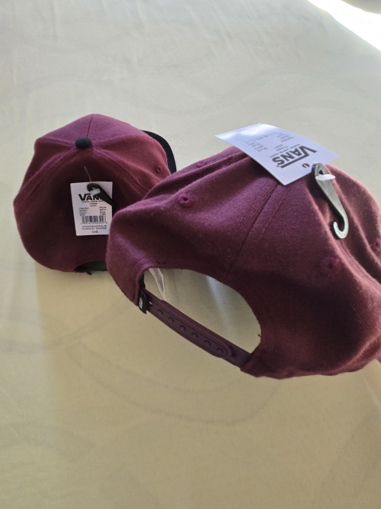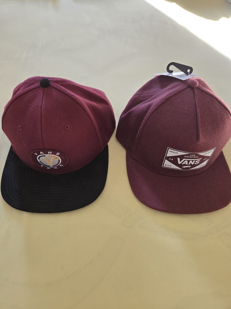 I have two brand new Vans maroon-coloured snapback hats for sale. Both are in excellent condition and ready to be worn!