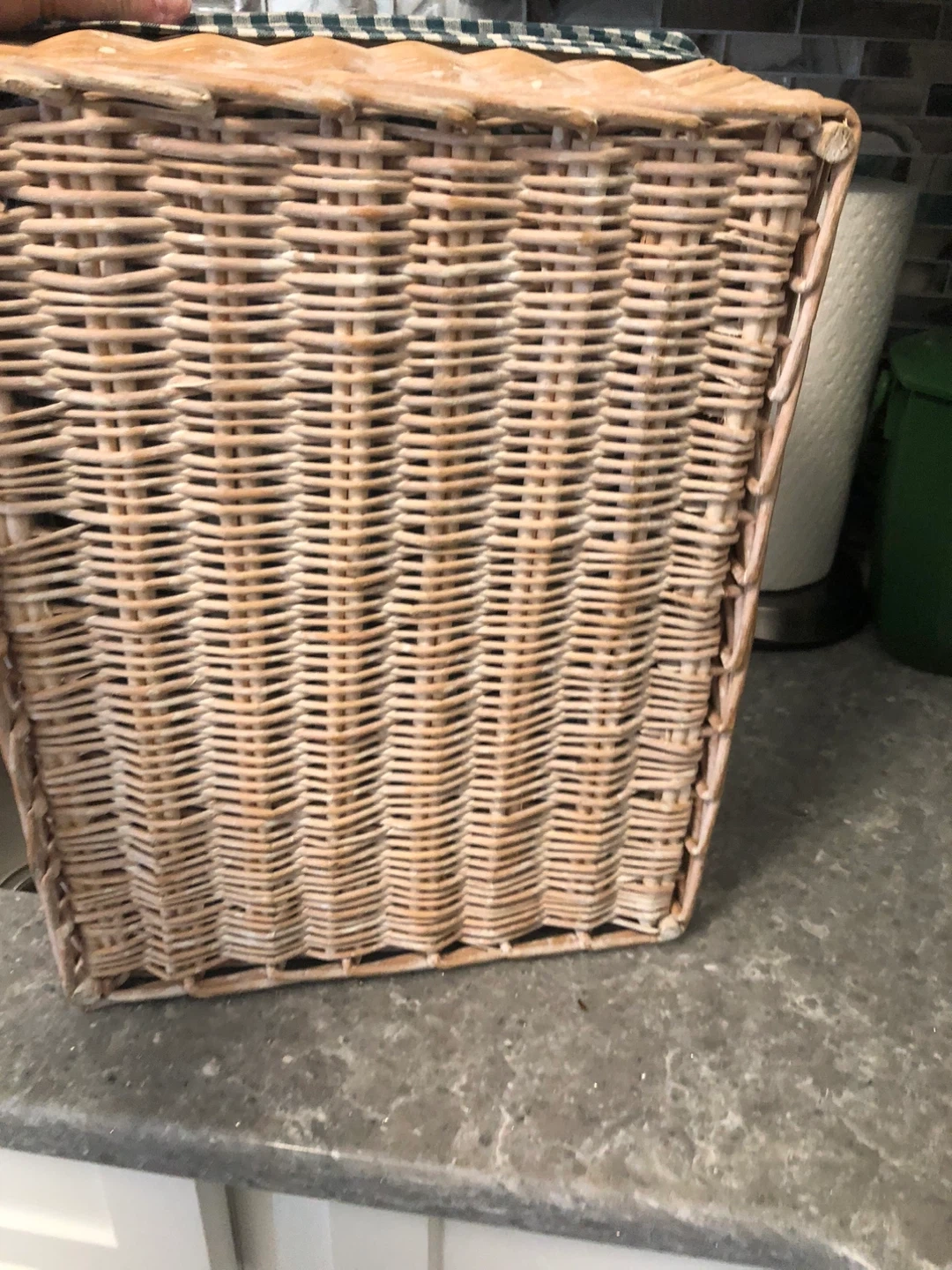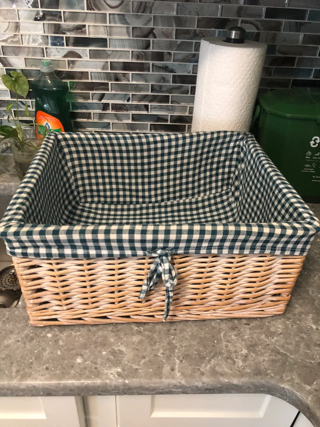 Here's a lovely wicker basket, perfect for storage or decor! It has a removable green and white gingham liner that adds a touch of country charm. It's in great condition and ready for a new home