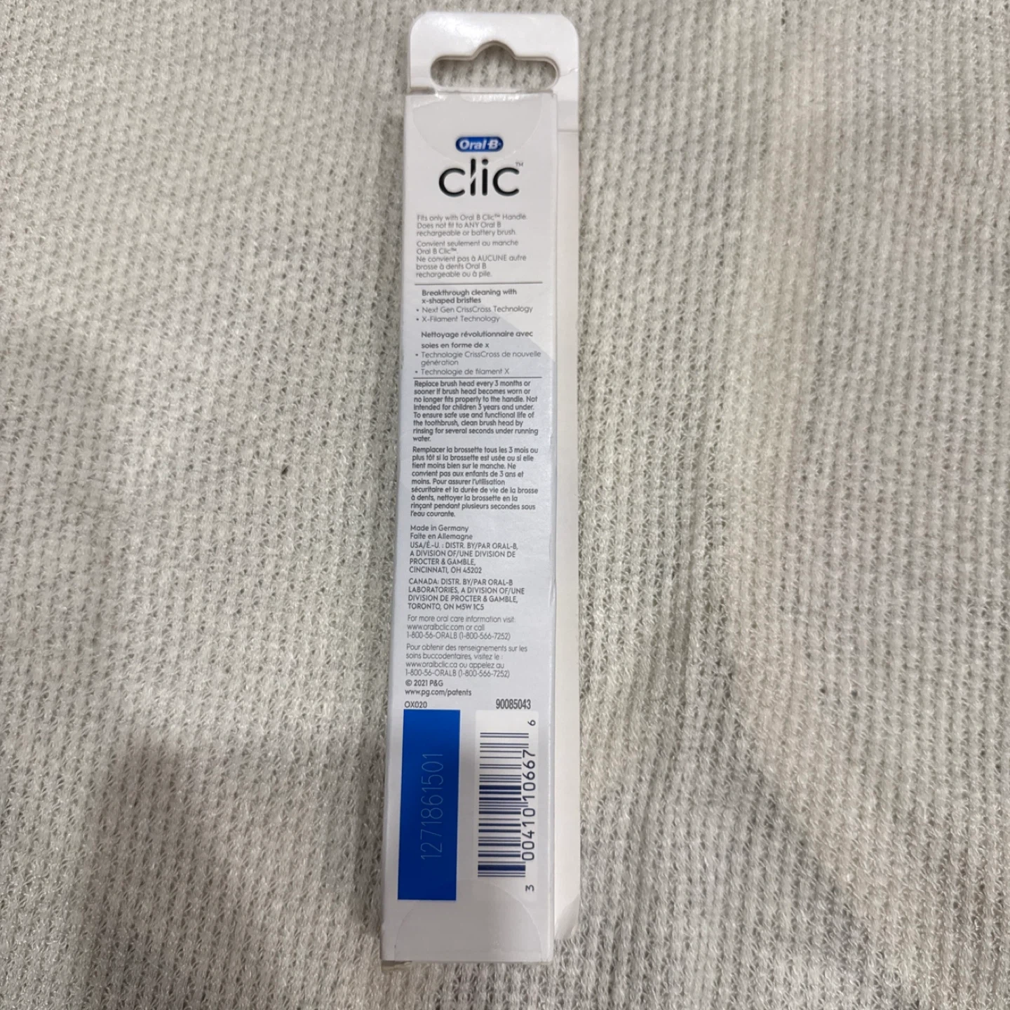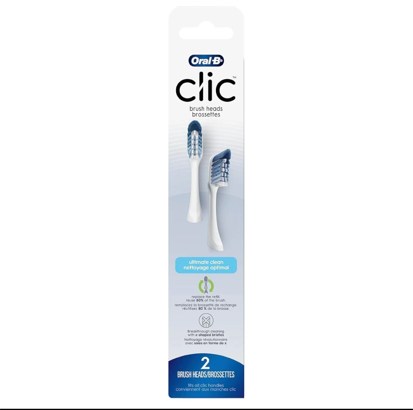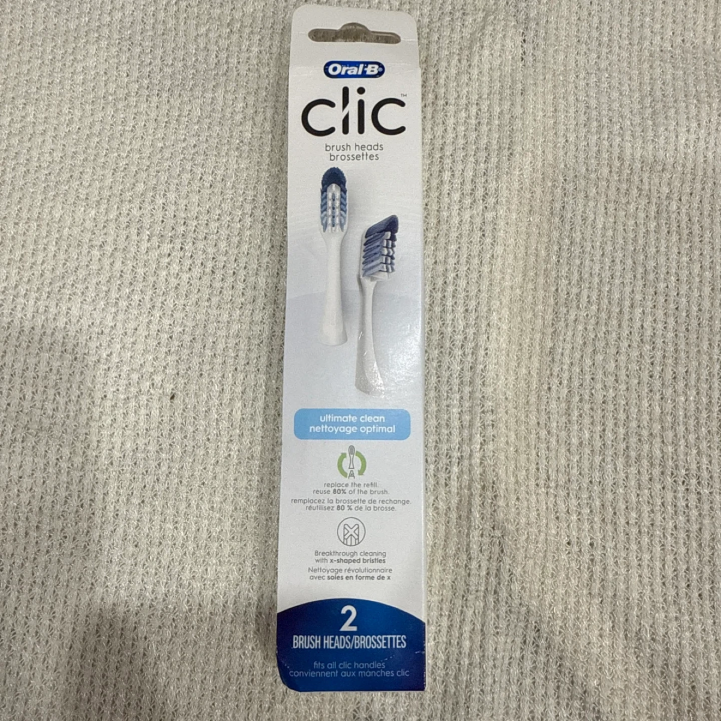 Selling a pack of Oral-B Clic brush heads! This pack contains 2 brush heads designed for the Oral-B Clic handle. They offer ultimate cleaning with a breakthrough design featuring x-shaped bristles. Replace the brush head every 3 months for optimal hygiene
