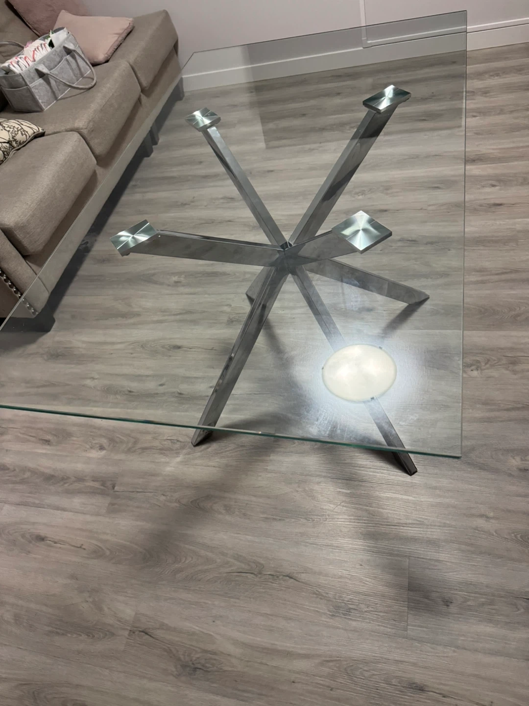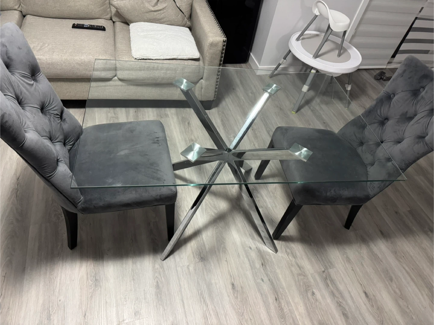 Selling a stylish glass dining table paired with comfortable grey velvet chairs! The table features a unique star-shaped chrome base, and the chairs have a button-tufted design. This set would be a great addition to any dining room or kitchen space. The chairs are in great condition and very comfortable for everyday use.