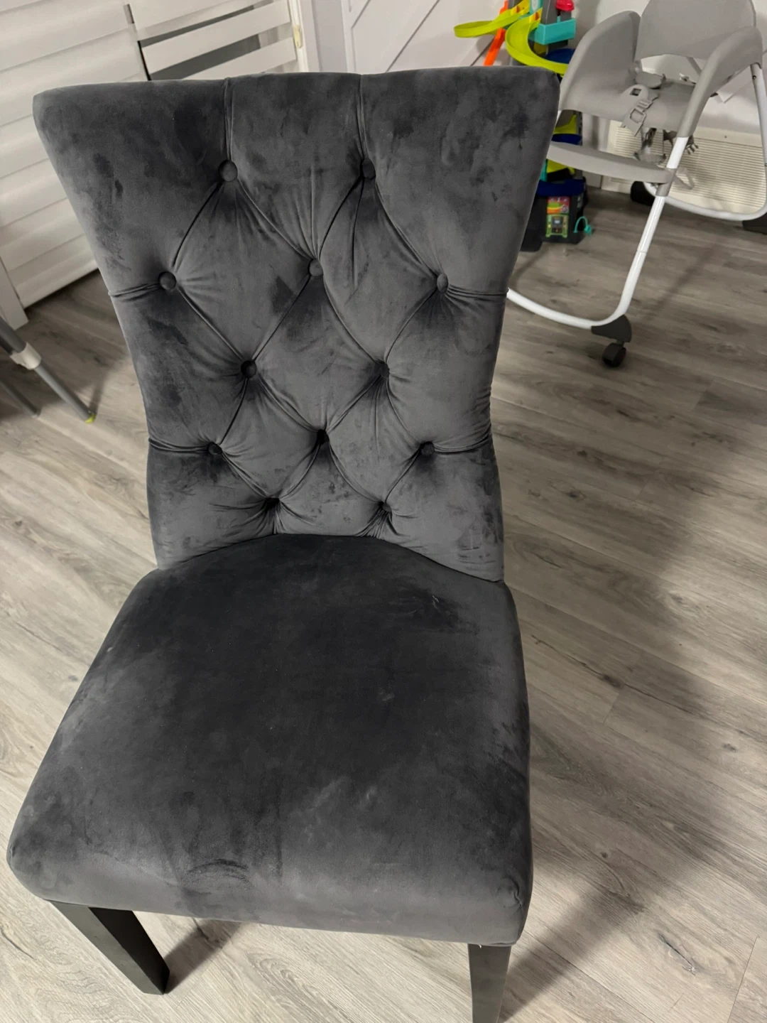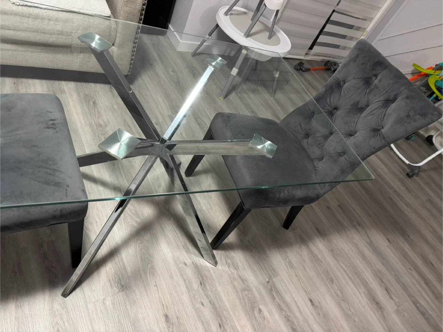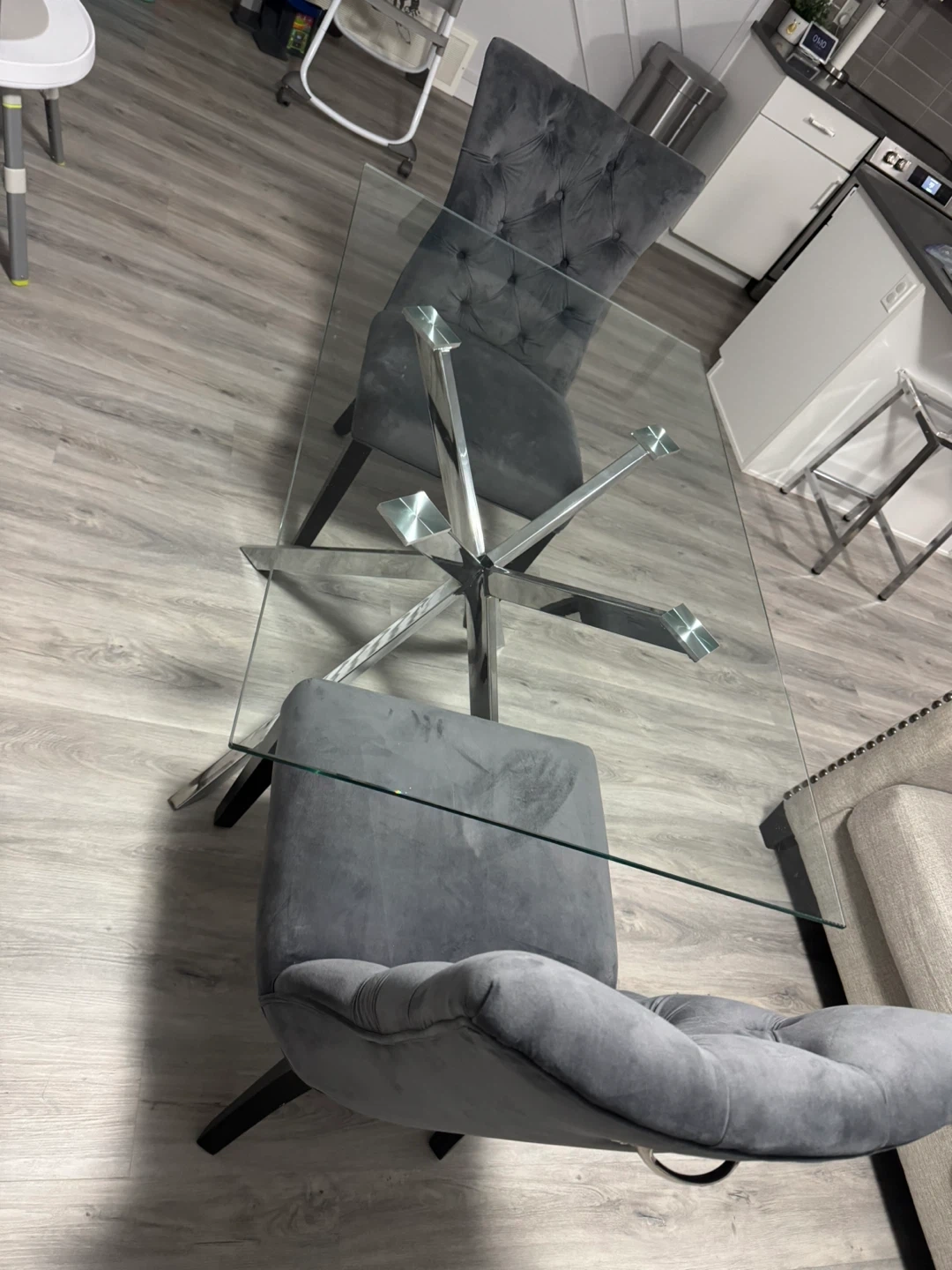 Selling a stylish glass dining table paired with comfortable grey velvet chairs! The table features a unique star-shaped chrome base, and the chairs have a button-tufted design. This set would be a great addition to any dining room or kitchen space. The chairs are in great condition and very comfortable for everyday use.