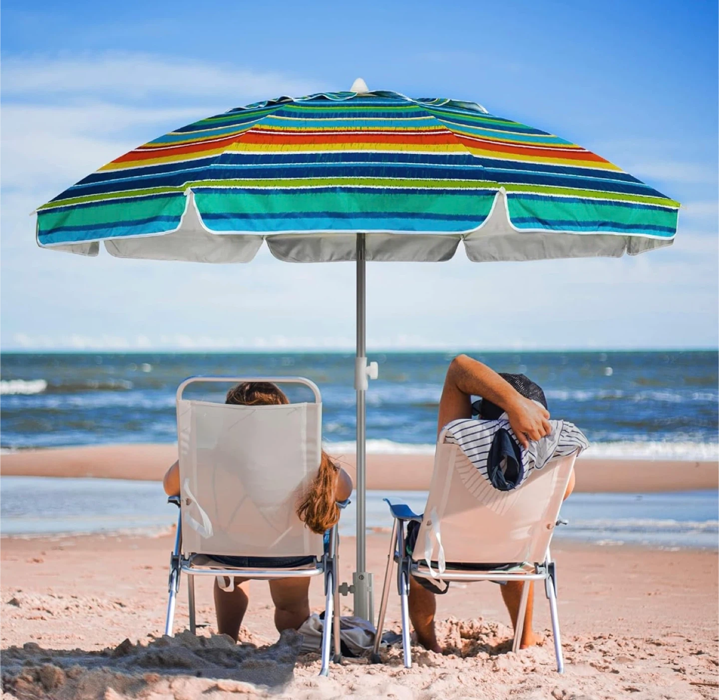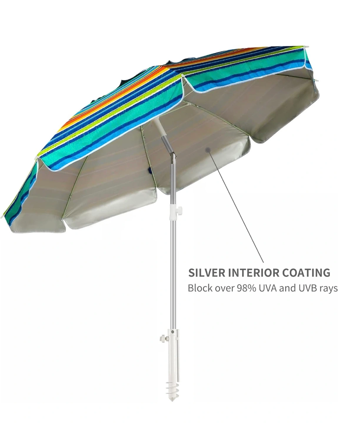 Sun Protection: Featuring a silver-coated interior, the beach umbrella provides UPF 50+ protection for your skin, capable of blocking more than 98% of UVA and UVB rays. The umbrella’s tilt function allows you to adjust the angle for optimal shade throughout the day.
