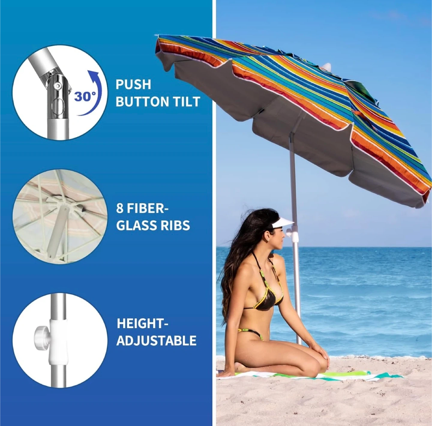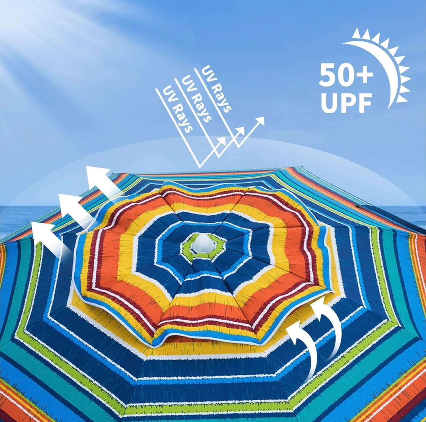 Sun Protection: Featuring a silver-coated interior, the beach umbrella provides UPF 50+ protection for your skin, capable of blocking more than 98% of UVA and UVB rays. The umbrella’s tilt function allows you to adjust the angle for optimal shade throughout the day.