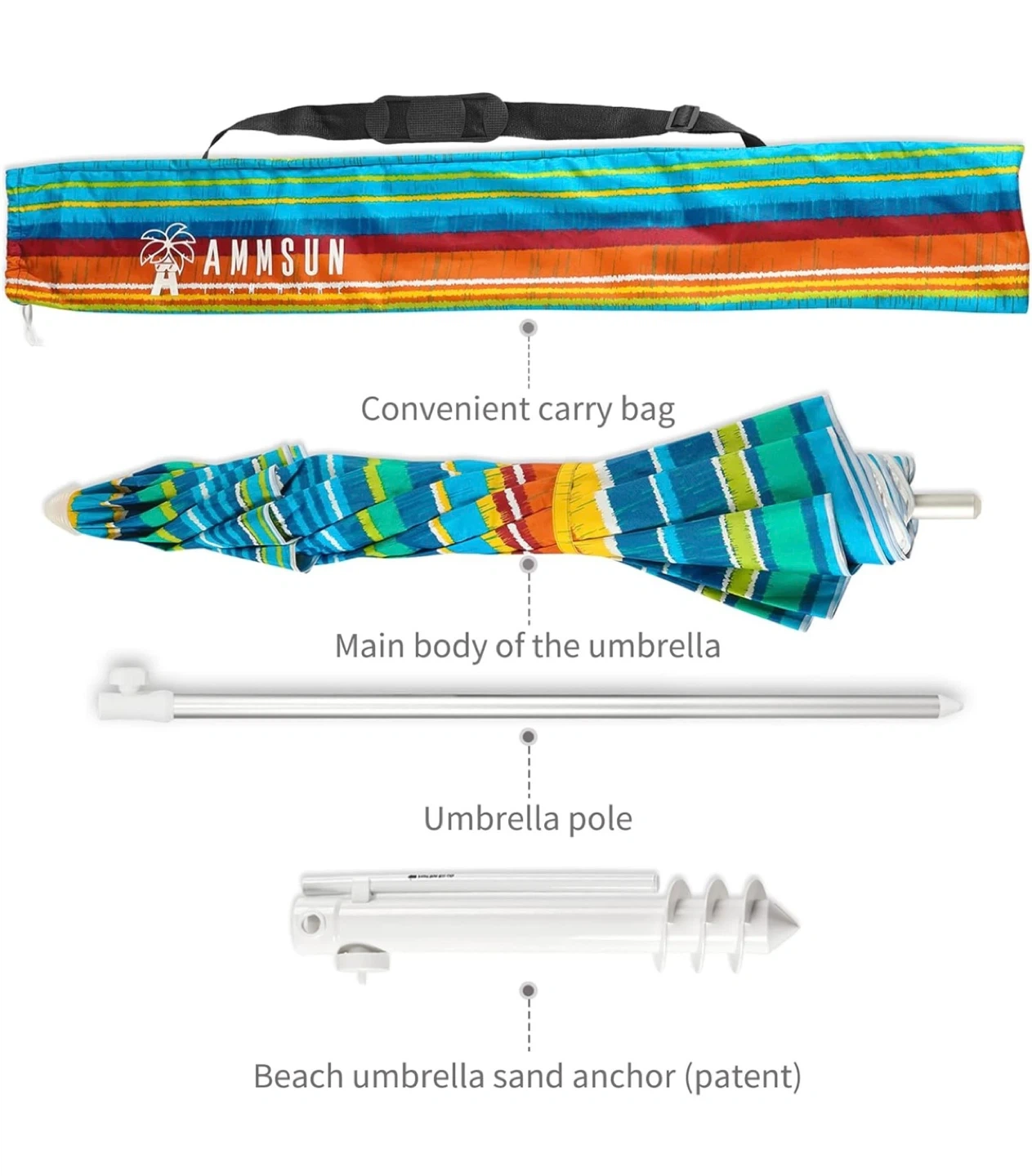 With Removable Sand Anchor: The 6.5 ft beach umbrella comes with a portable, reinforced sand anchor that makes it easier and sturdier to secure your beach umbrella in sand or soil. Once the anchor is removed, it can also be used in the yard.