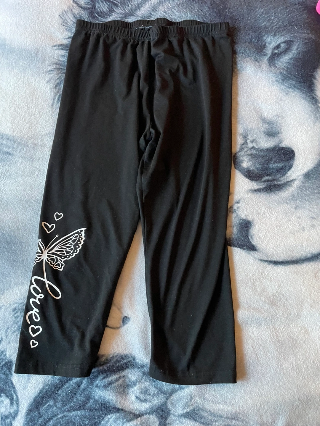 Selling a pair of black leggings in size XL. They have a cute butterfly and 'love' design on the leg. Made of 95% polyester and 5% elastane.