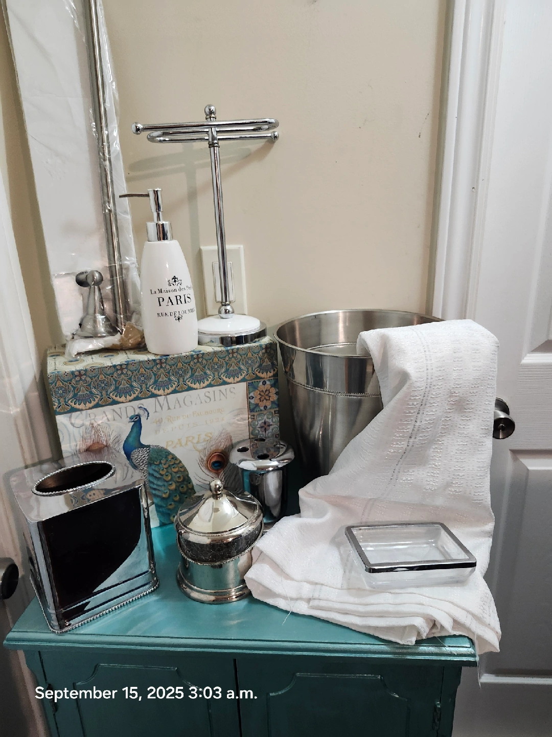 toorh brushbholder, soap dispenser, hand and bath towel bars, cotton/ear cleaner container.