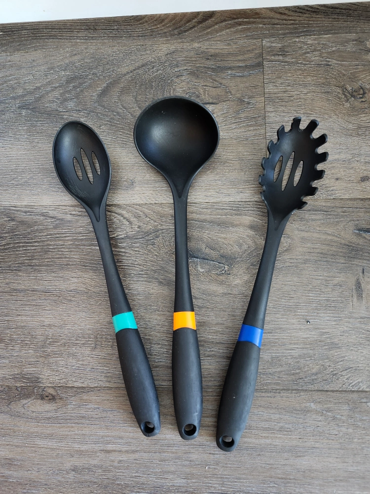 Selling a set of three black kitchen utensils. Includes a slotted spoon, a ladle, and a pasta server. Great for any kitchen!