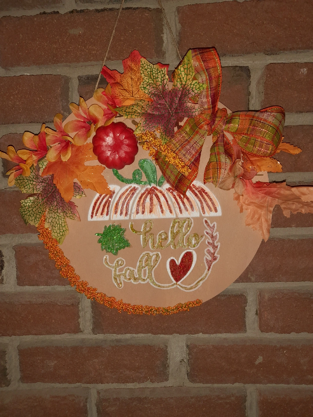 Cute fall themed door hanger with leaves, flowers, and a pumpkin design. Perfect for adding a touch of autumn to your home!