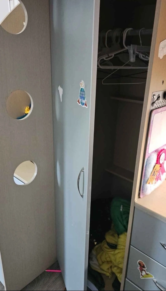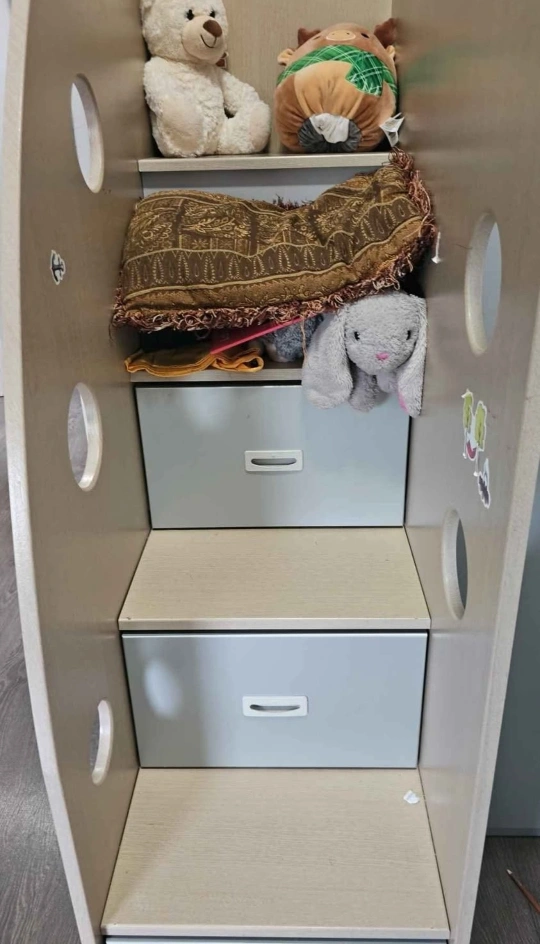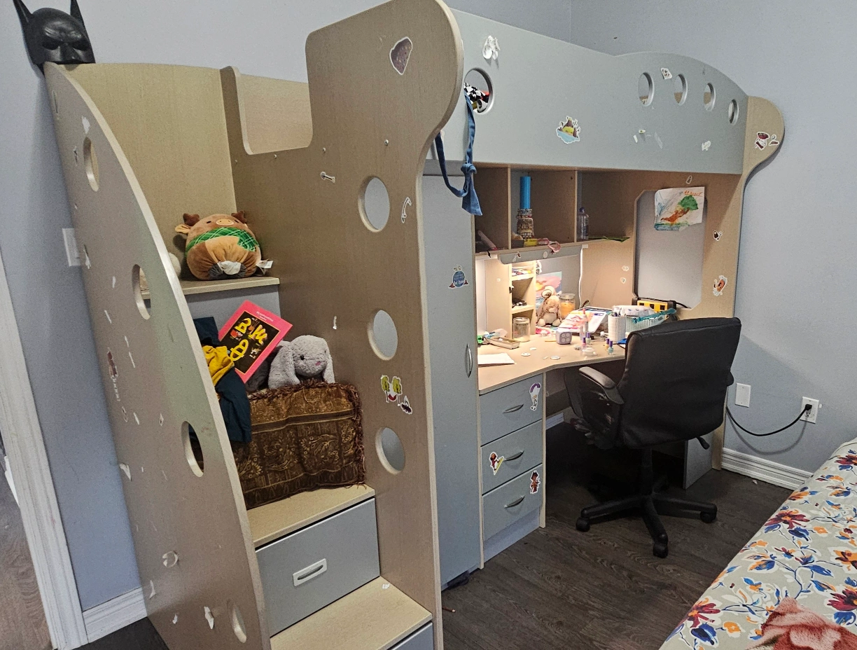 Selling a kids loft bed! It features a built-in desk area, closet space, and storage drawers in the stairs. Perfect for maximizing space in a smaller room and keeping everything organized. It's in good condition and ready for a new home! ***Only ask to get it if you can bring 2 ppl and a van or truck to take it. It's not a single person job, need 2 strong ppl able to lift weight.