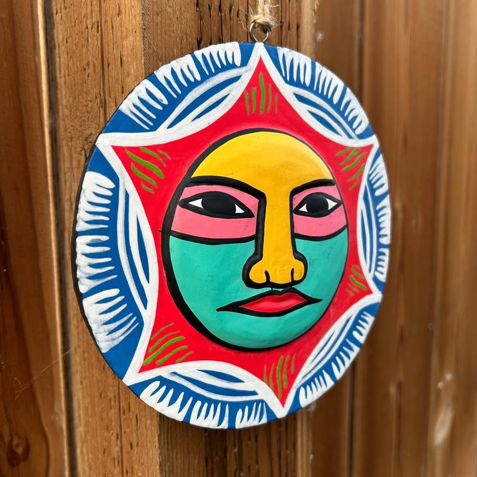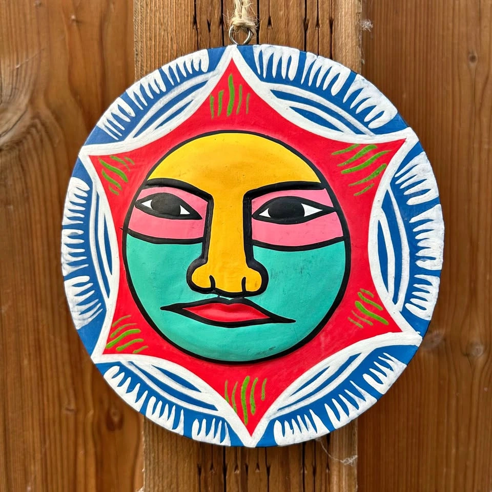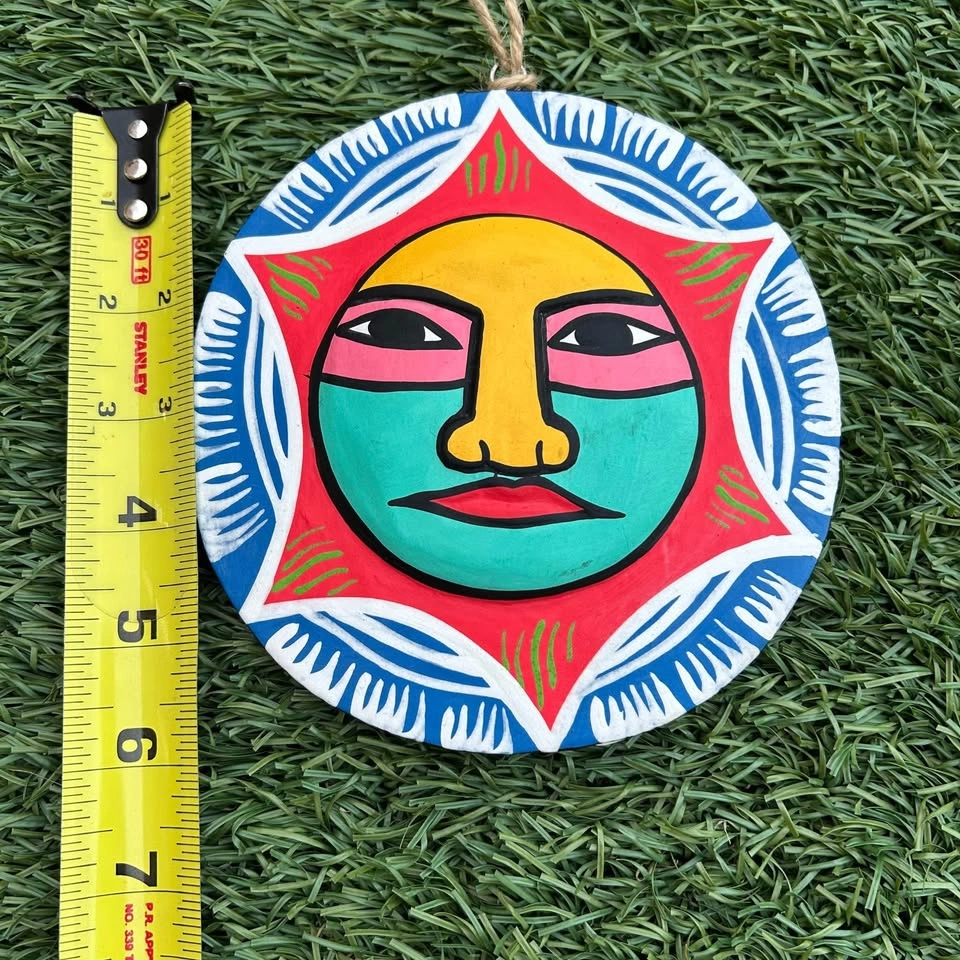 Beautiful hand-painted Mexican folk art wall hanging featuring a vibrant sun face design. Crafted from wood and painted in bold traditional colors, perfect for adding warmth and character to any space. Diameter: approx. 6” (see photo with tape measure) Style: folk art, sun face motif A lovely piece, great for wall displays indoors or on a covered patio. Pick up: Seton area, Calgary. See also my other lots. Open to your questions and suggestions. If necessary, I provide additional photos. These are not new things, so please look carefully at the photos and videos. Sizes are submitted on request and also using a tape measure in the photo.