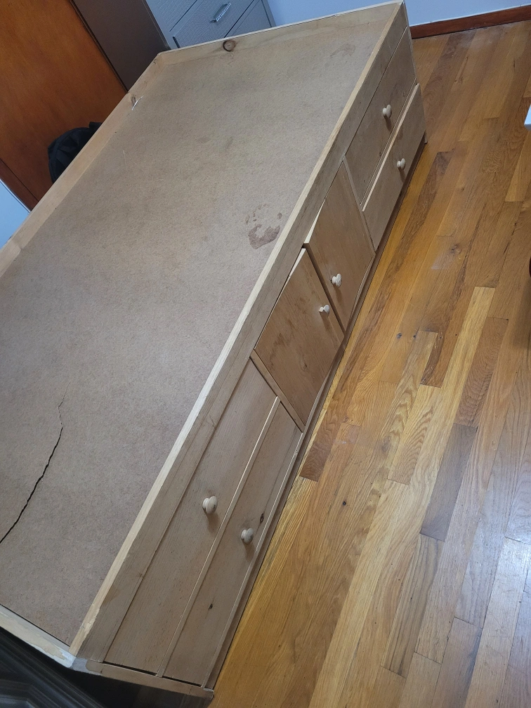 Selling a wooden bed frame that comes with built-in drawers for extra storage. It's perfect for keeping your room tidy and organized. There is a crack on the side of the bed frame.