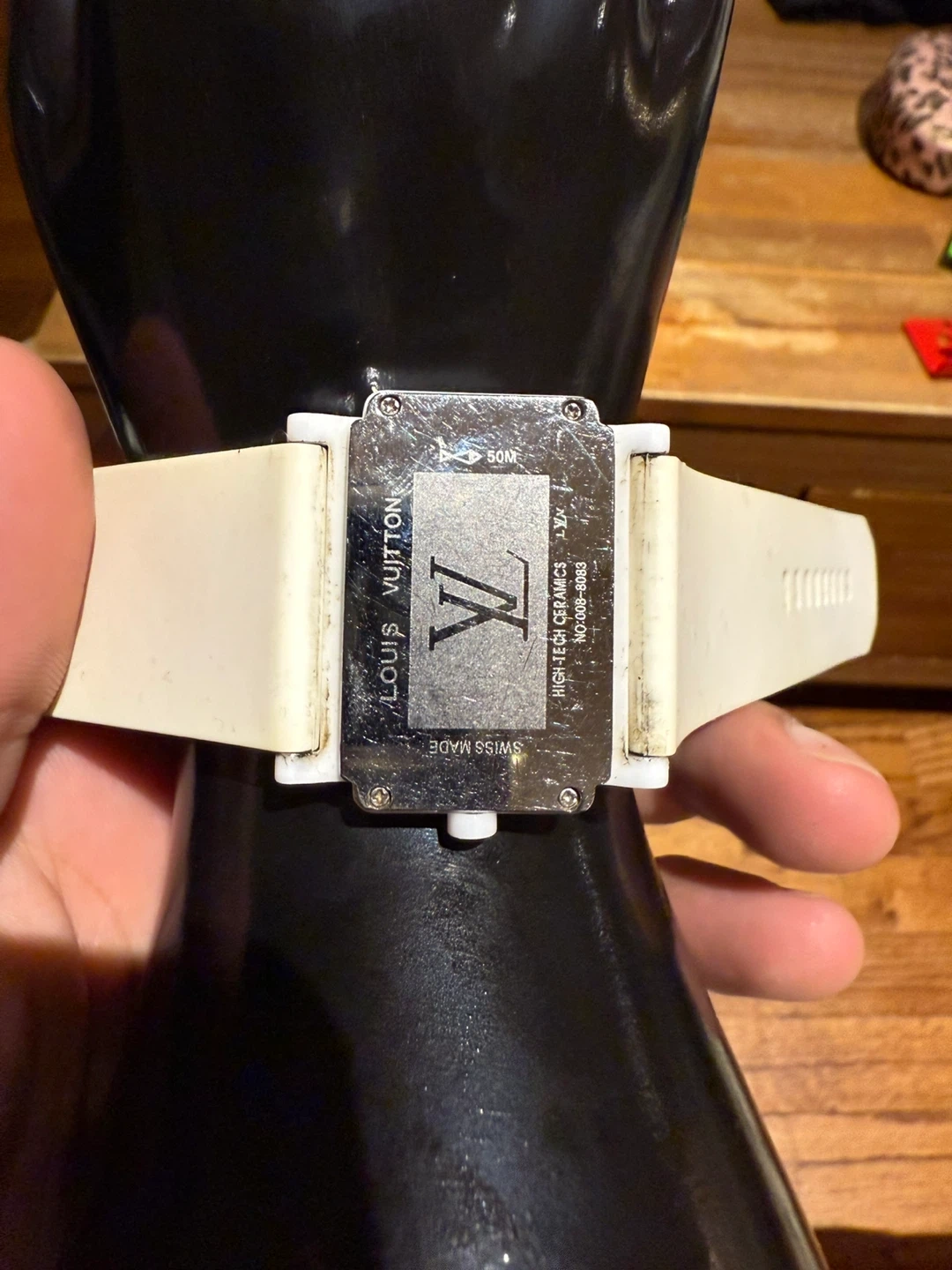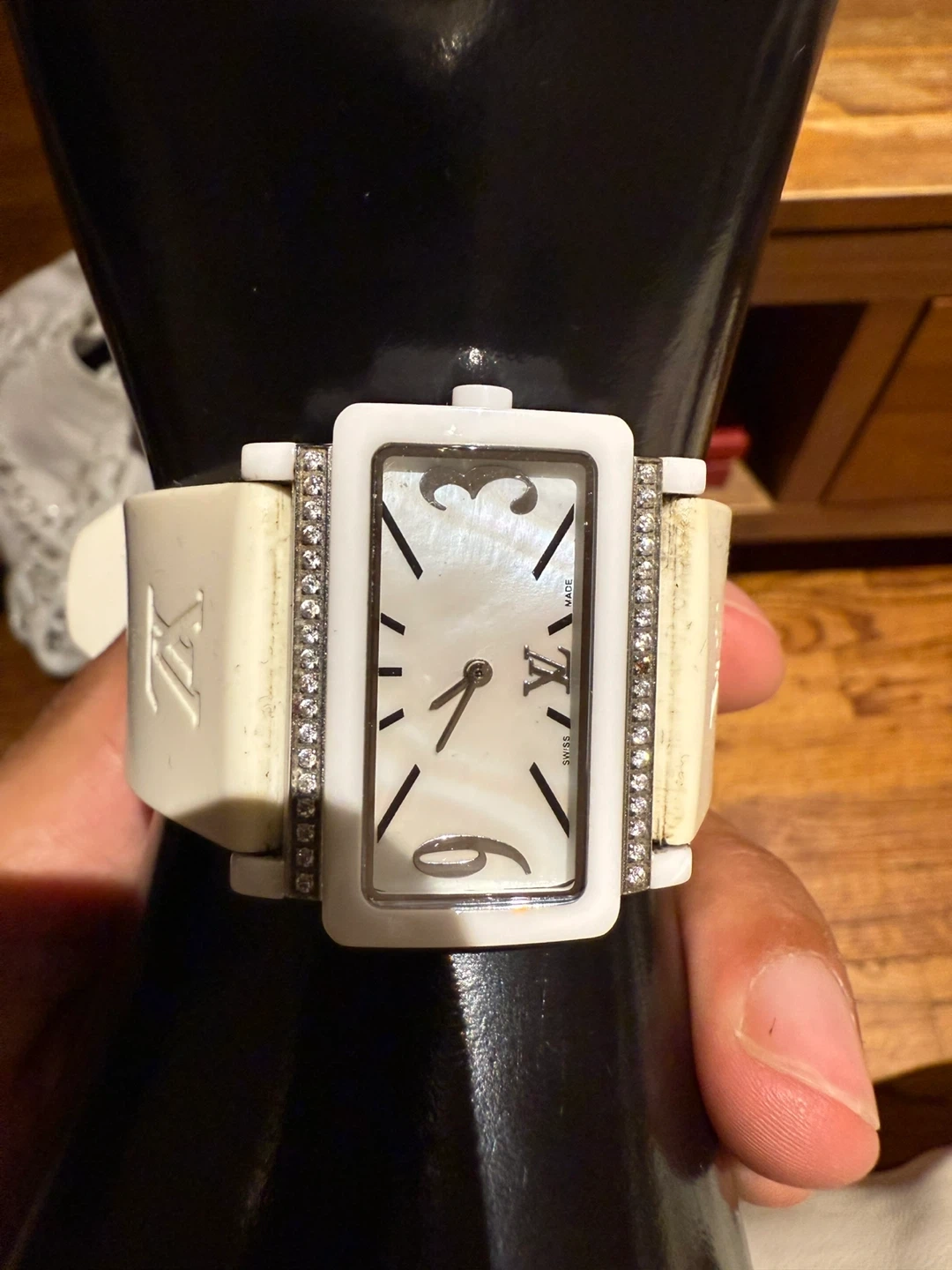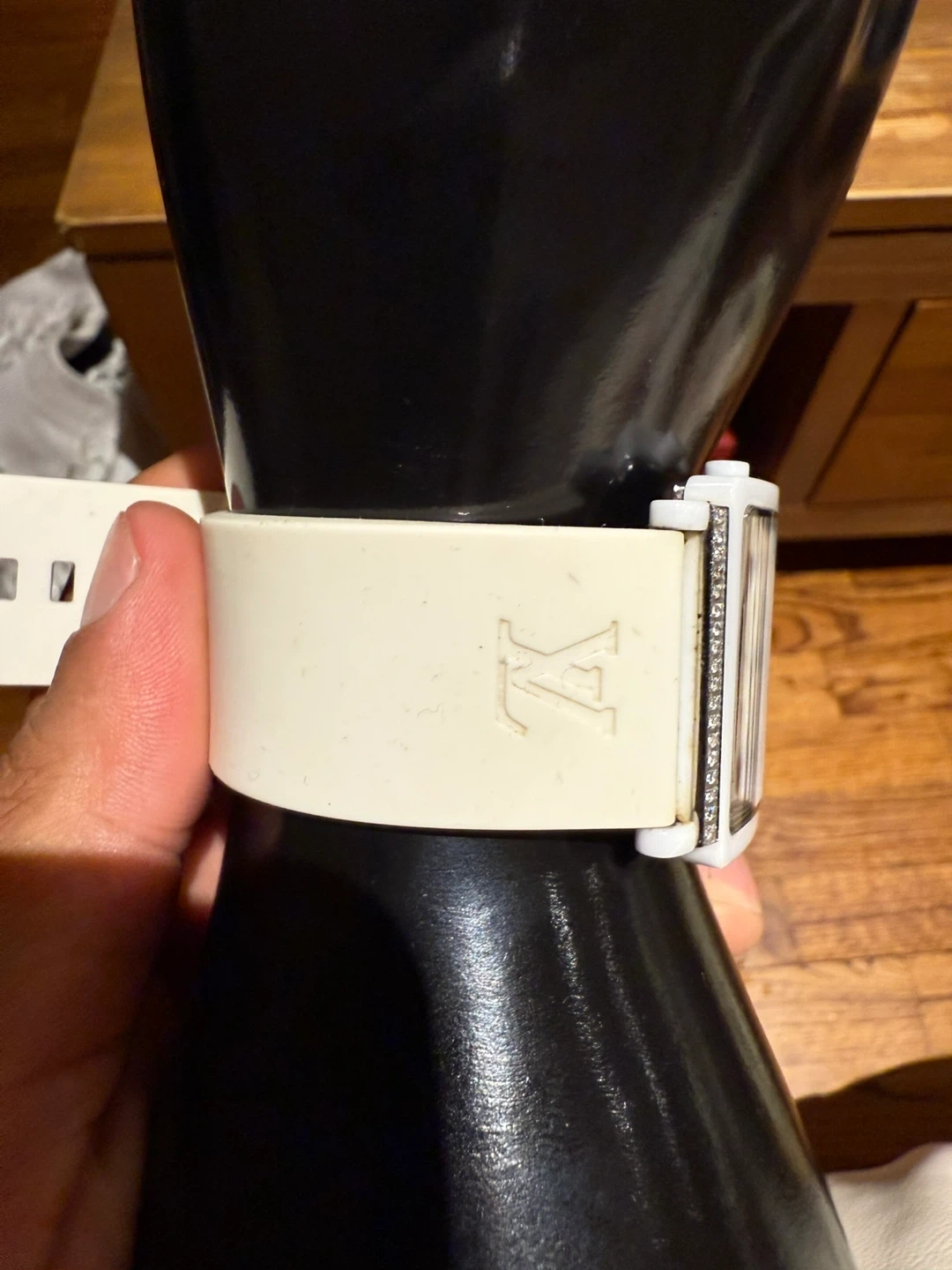 Selling a Louis Vuitton High Tech Ceramic watch. It has a white band and a rectangular face with diamond accents. There are some signs of wear on the band, but overall it is in good condition
