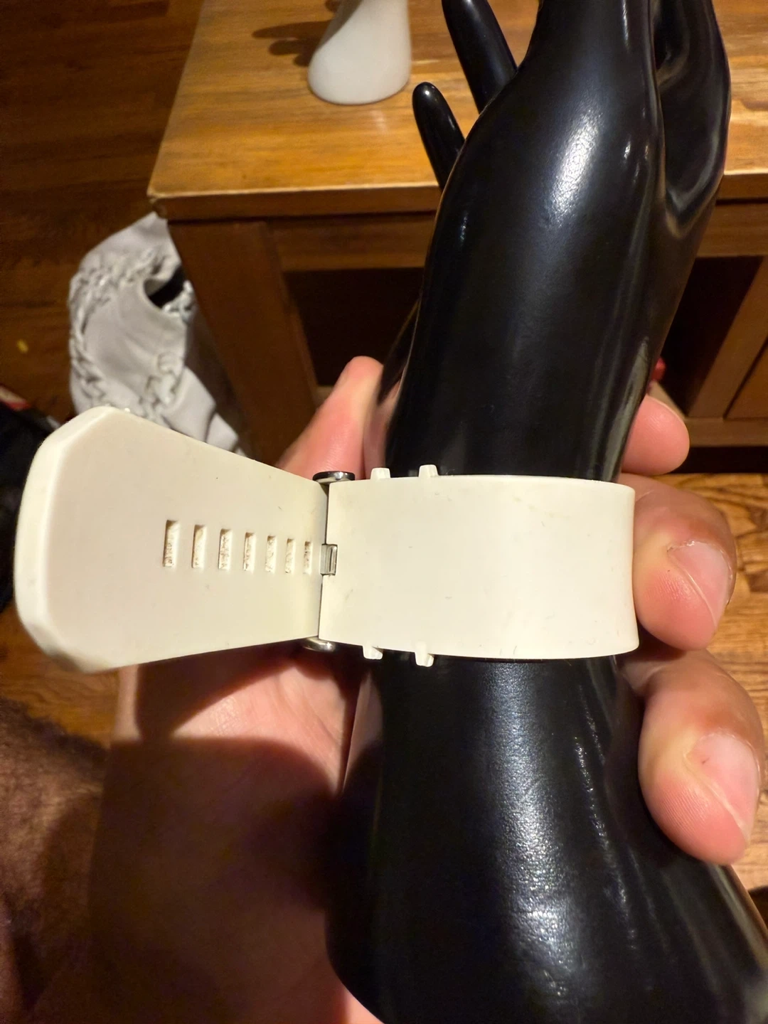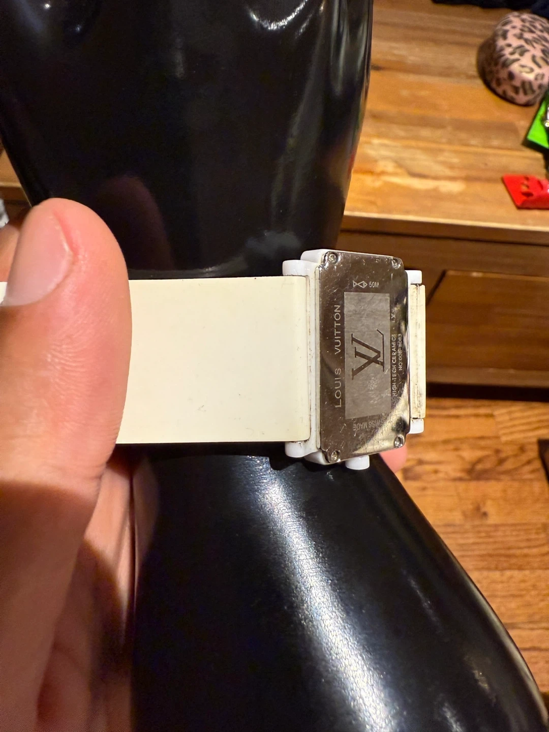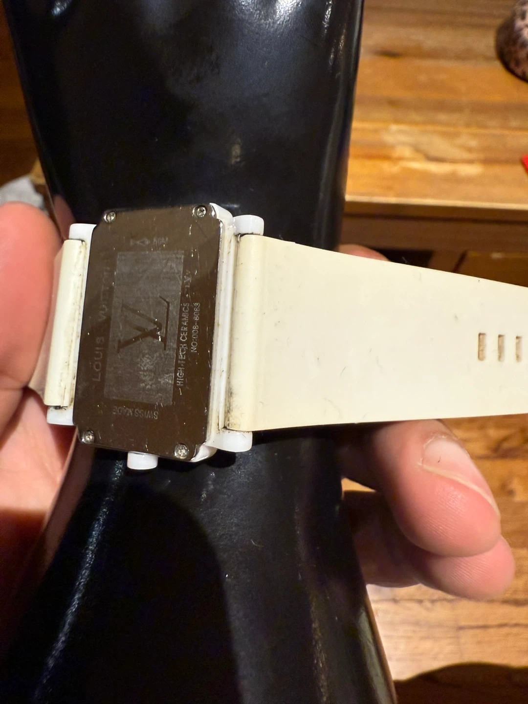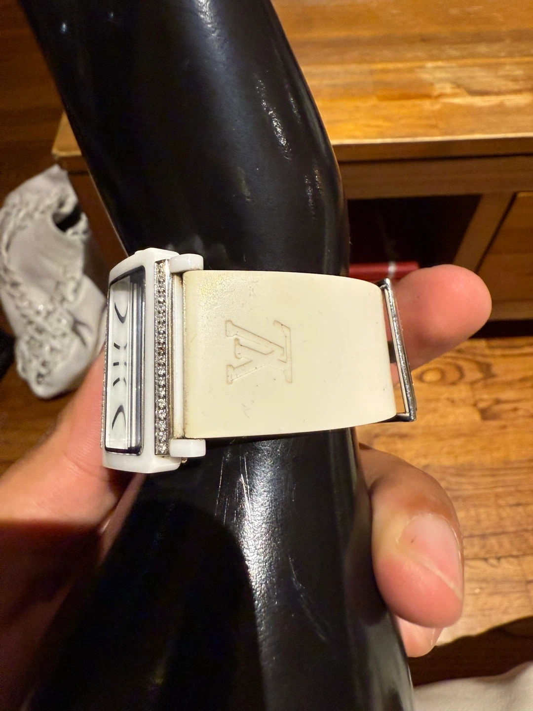 Selling a Louis Vuitton High Tech Ceramic watch. It has a white band and a rectangular face with diamond accents. There are some signs of wear on the band, but overall it is in good condition