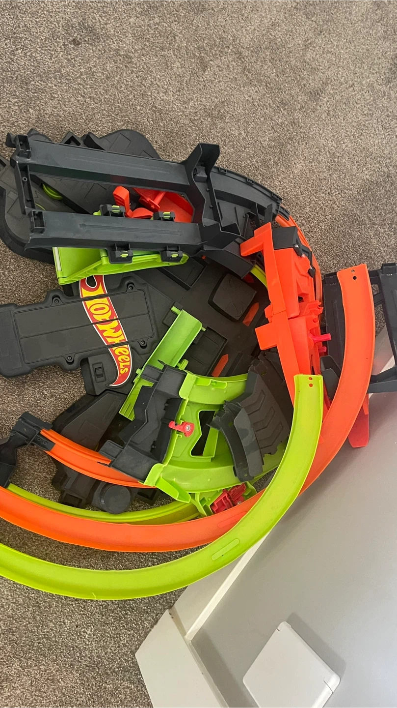 10Selling a Hot Wheels track set! It's in great condition and ready for lots of fun. Includes various track pieces in black, orange, and green. Perfect for building awesome race courses!