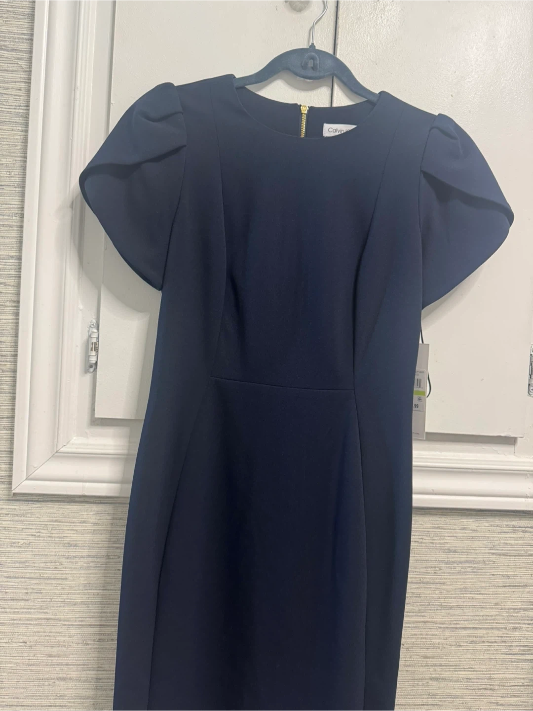 This is a stylish Calvin Klein dress in navy blue. It's a size 4 and features a gold zipper in the back. Originally bought for $89.99!