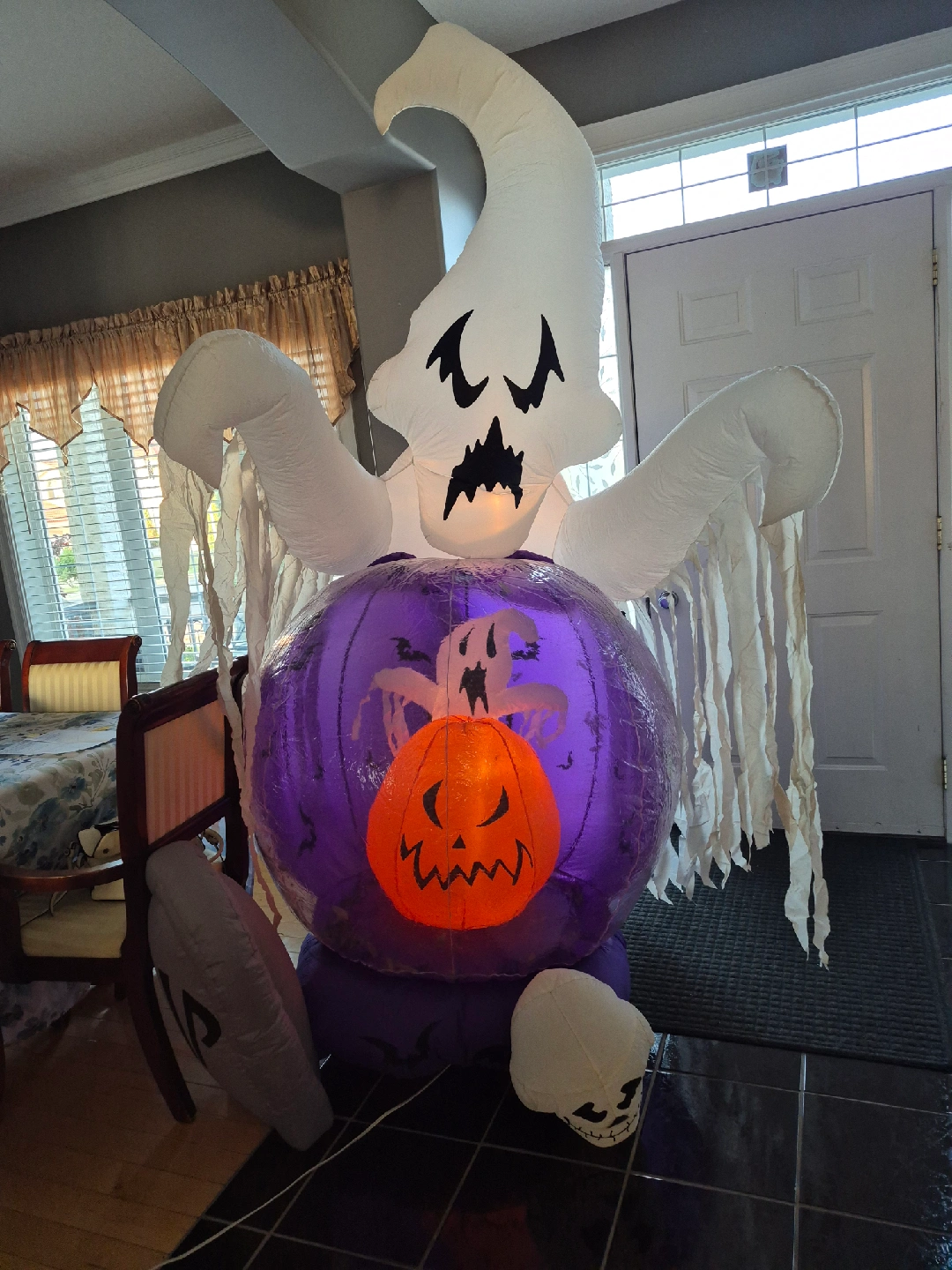 Get ready for Halloween with this fun inflatable decoration! It features a ghost emerging from a purple pumpkin with an orange jack-o'-lantern face. It's sure to add a spooky touch to your yard or home this Halloween season