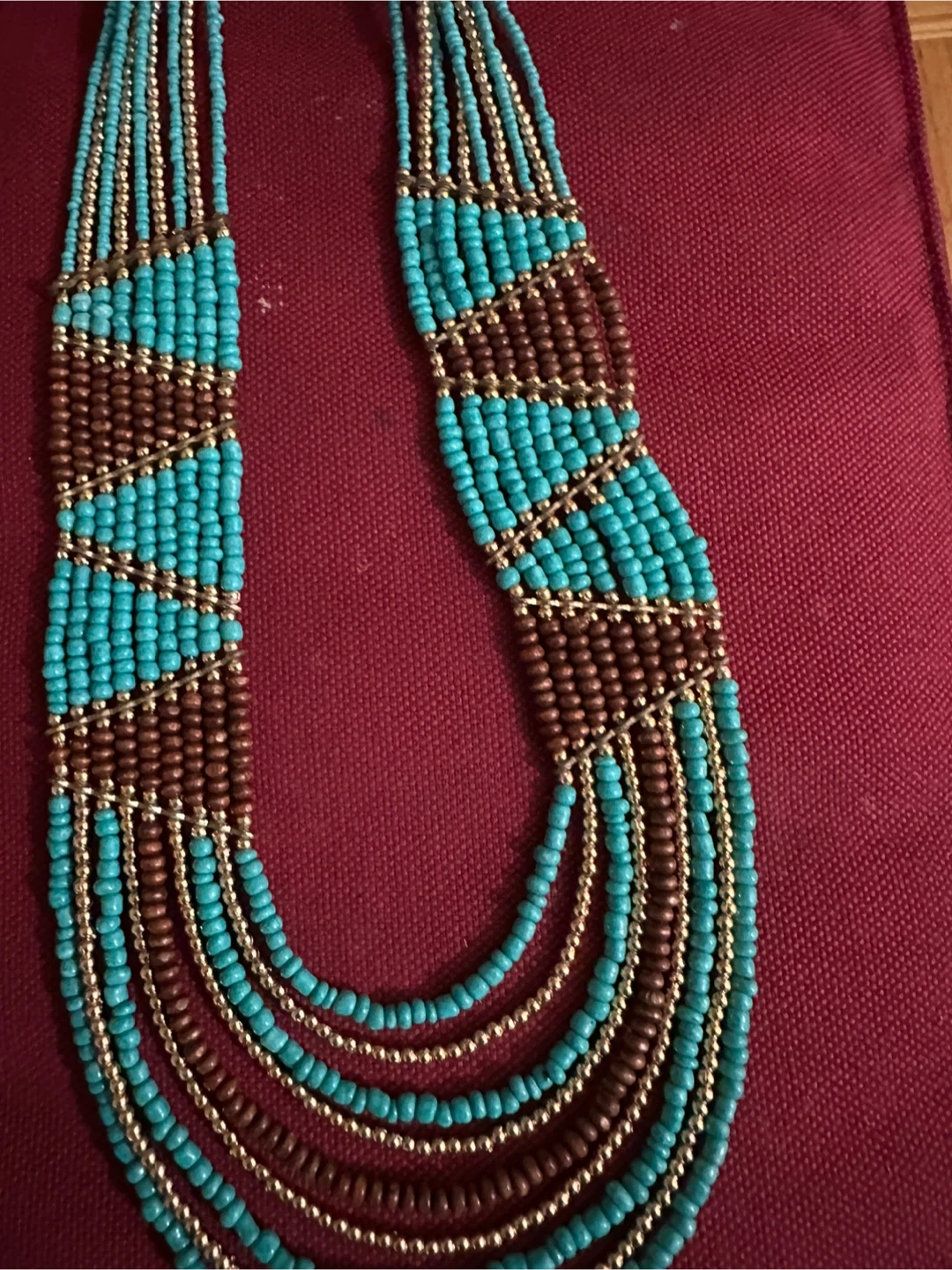 Gorgeous beaded necklace featuring layers of turquoise, brown, and gold beads. It's in great condition and adds a pop of colour to any outfit!