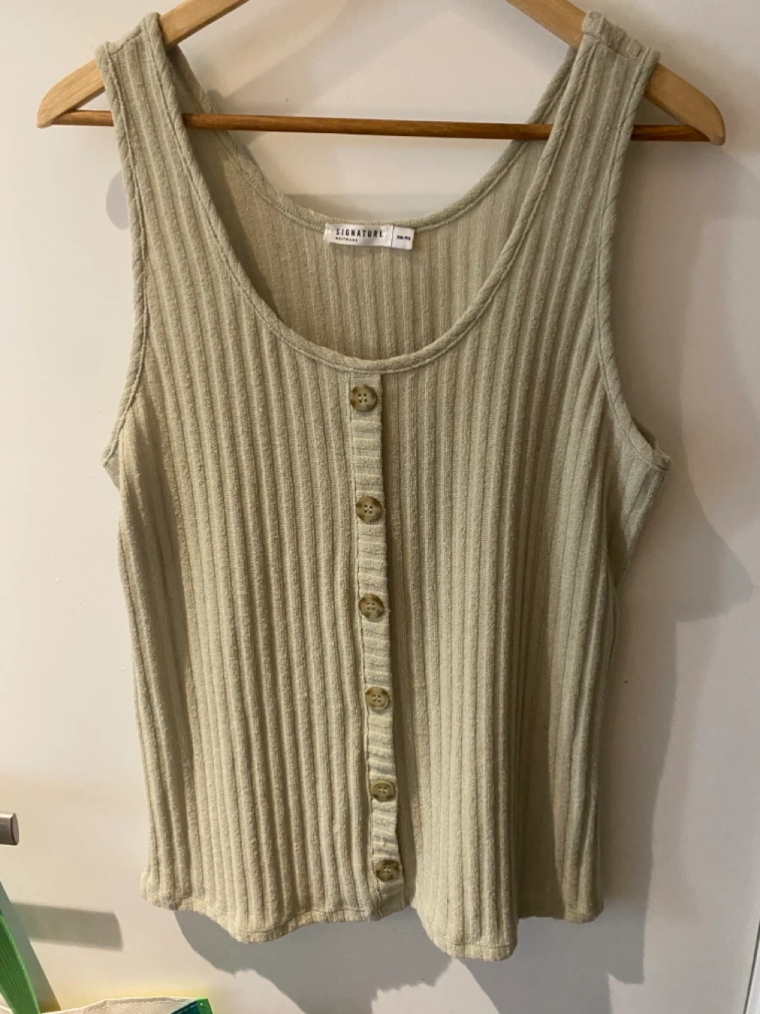 1000+Selling a cute tank top! It's a ribbed material with wooden button detailing down the front. The colour is a light green and it's a size xl fits like L .