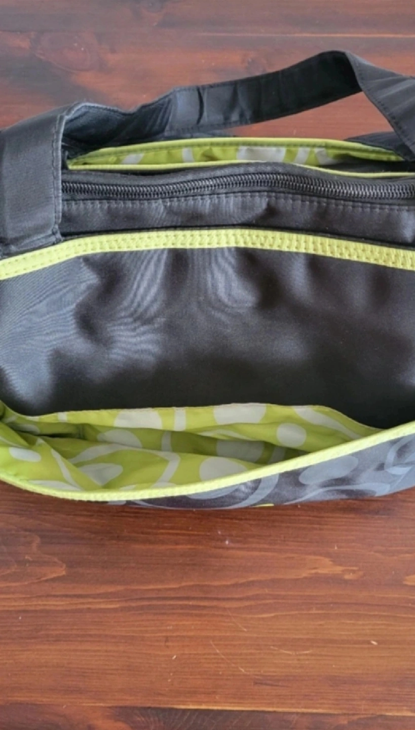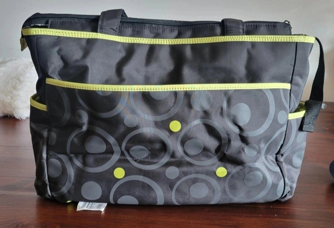 Giving away a Baby Boom diaper bag in grey with green trim! It has a stylish design with circles and yellow accents. There is a small tear on the front, as shown in the photos, but otherwise in good condition. Perfect for keeping all your baby essentials organized!