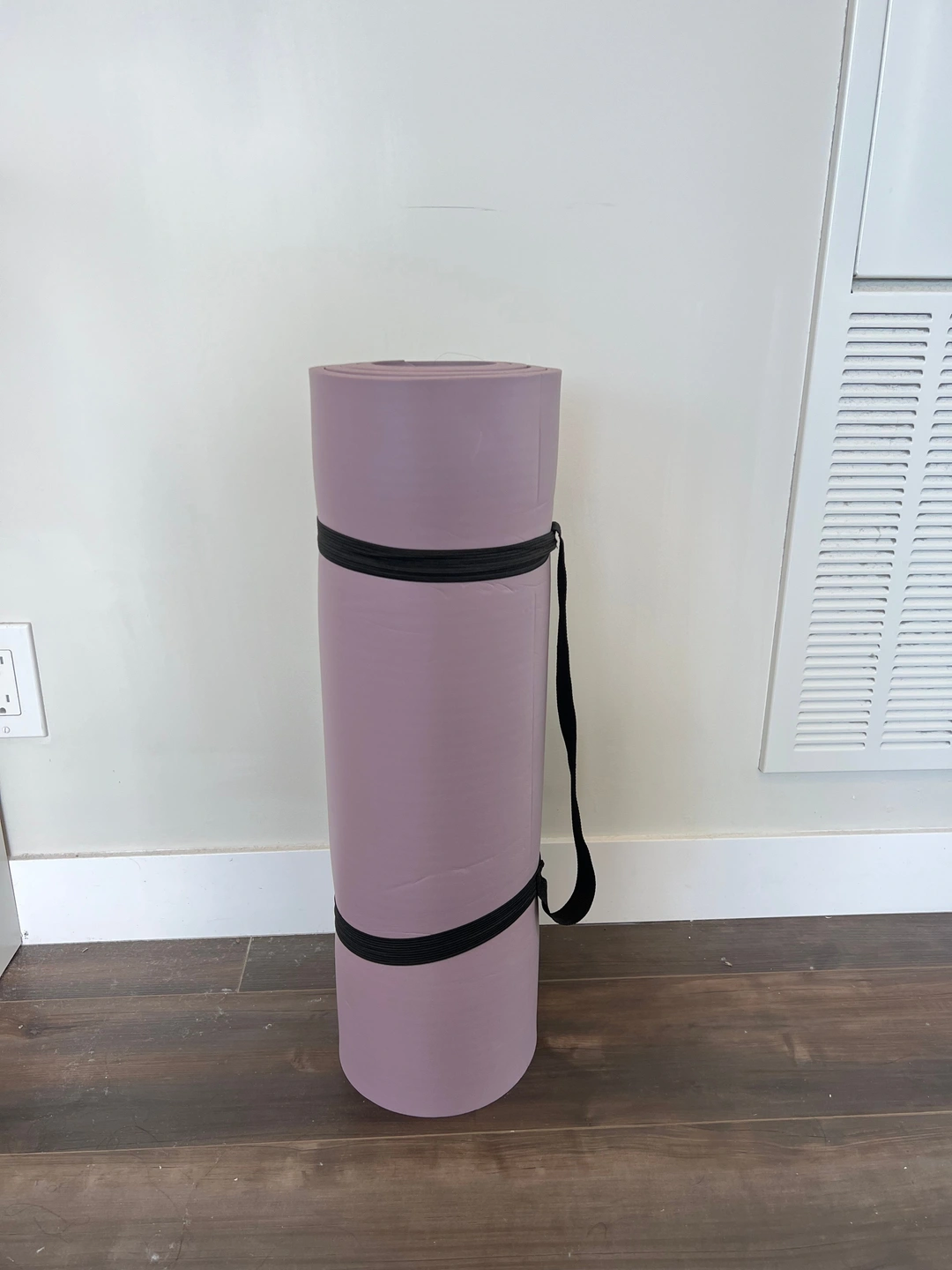 Selling a purple yoga mat that is ideal for yoga or home workouts. Slip-resistant and cushioning surface provides comfort during exercise. Easy to spray and wipe down. Included carrying strap makes it easy to take anywhere.
