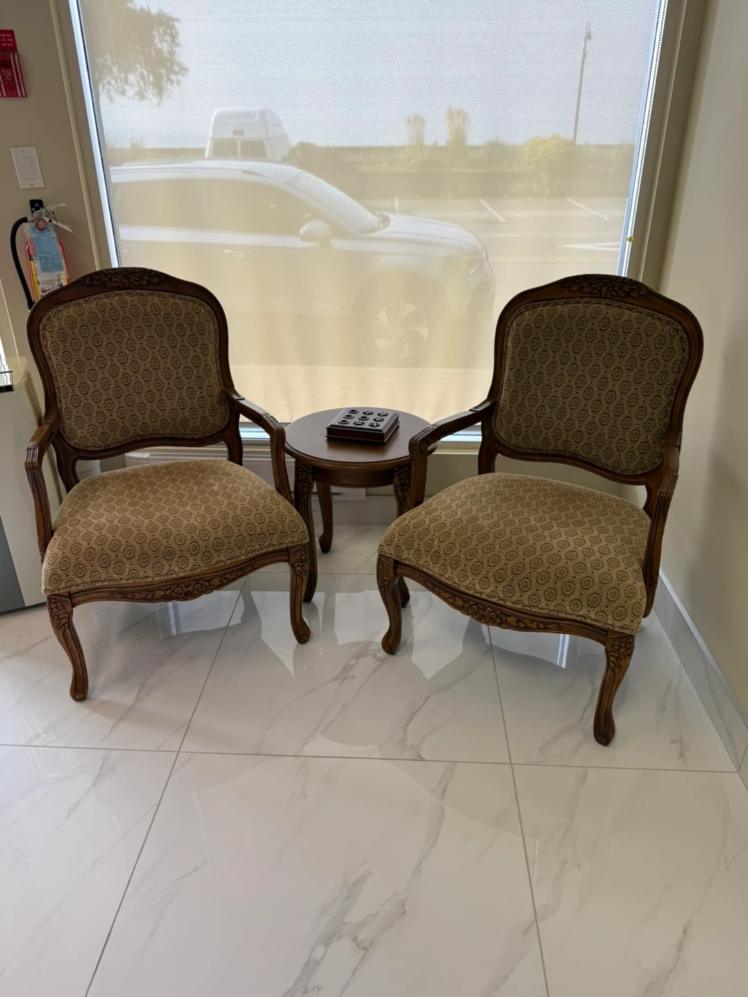 Selling a lovely set of two antique-style chairs! They feature a classic design with patterned upholstery and carved wood frames. A charming addition to any room!