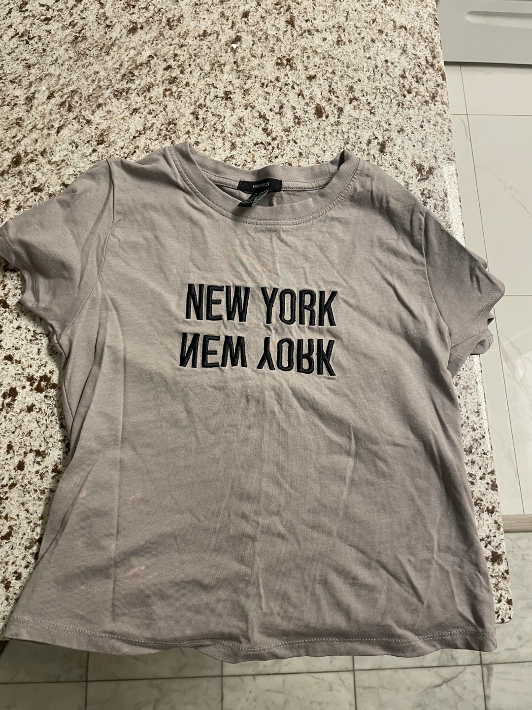 Selling a Forever 21 T-shirt with New York design, size S. It's a light grey colour and perfect for casual wear or around the house.