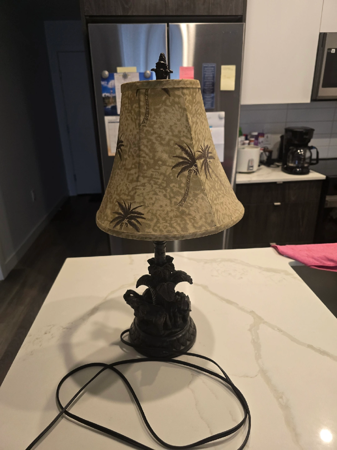 Selling a cute accent lamp with a palm tree design on the shade. It has a dark brown base with a detailed design. The lamp is in great shape and would be perfect for adding a bit of tropical flair to any room