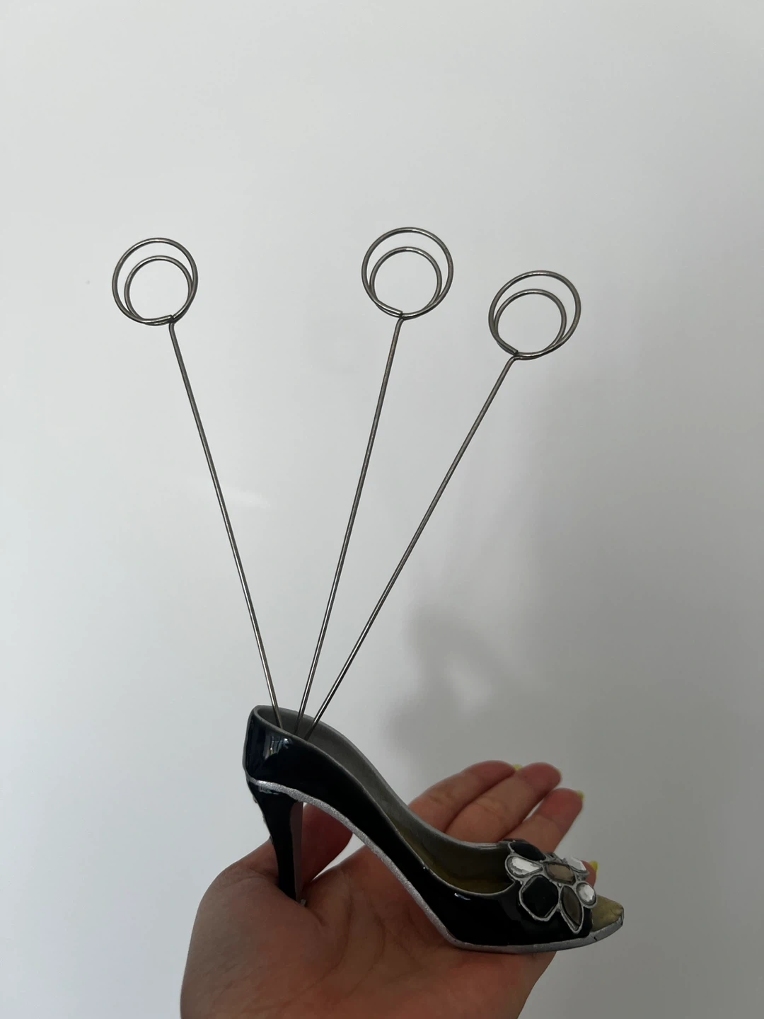 This is a cute little high heel shoe that can hold photos or notes using the wire holders. It's a unique and stylish way to display your favourite memories or important reminders