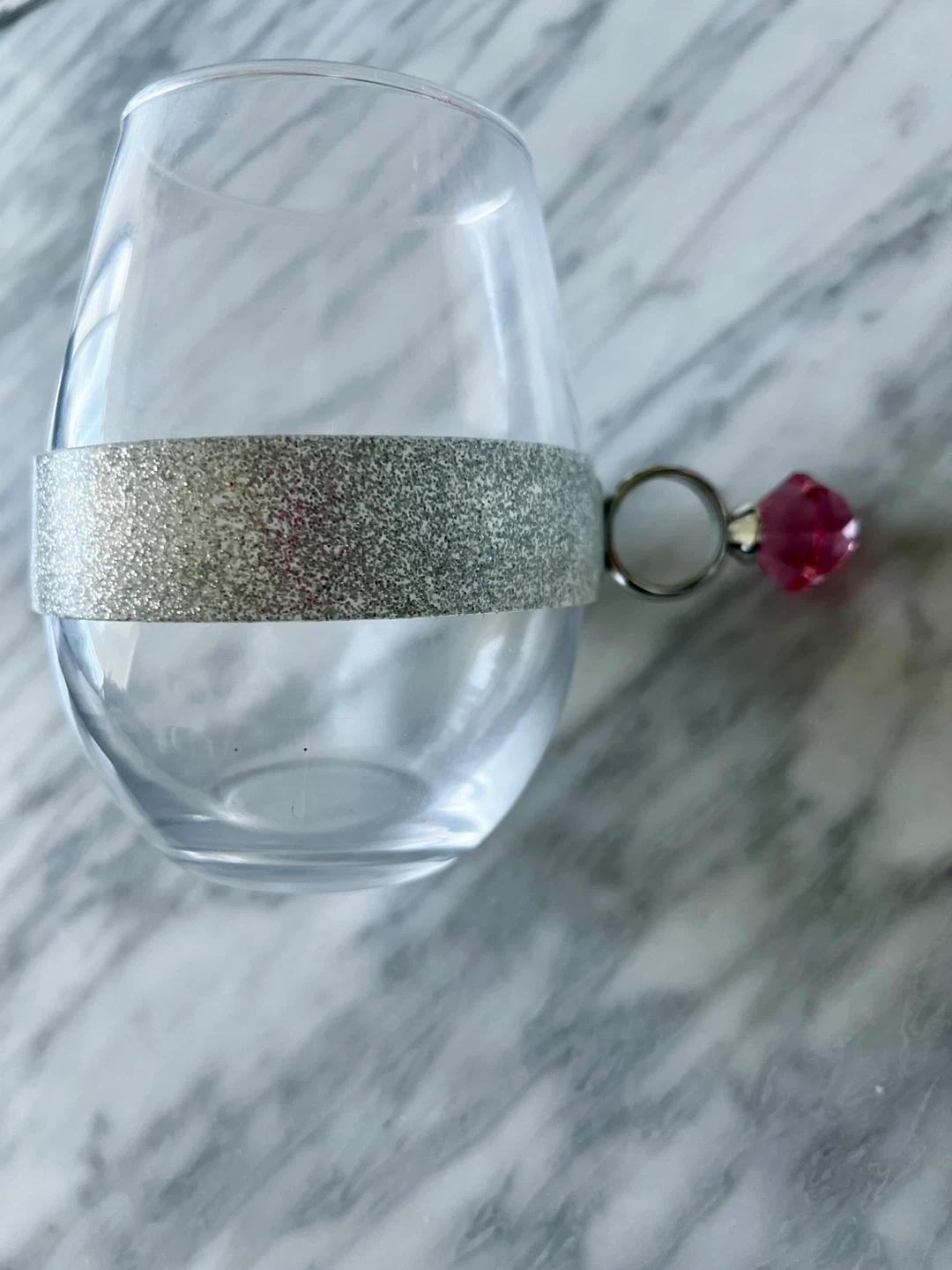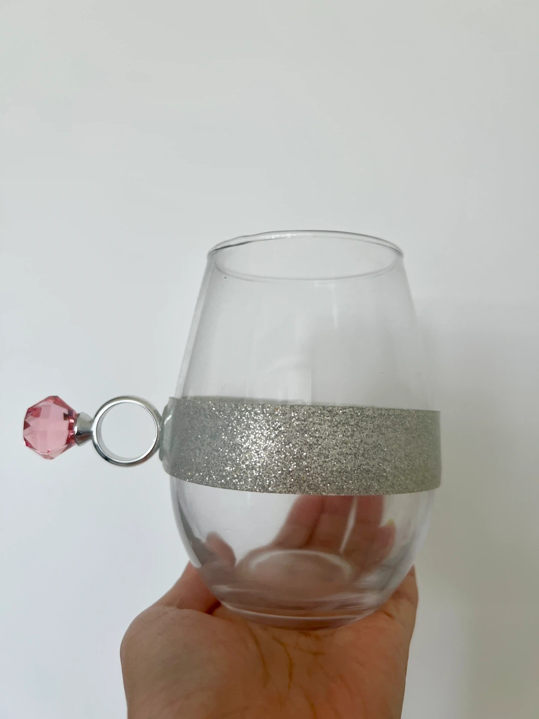 Here's a stemless wine glass that's sure to add a touch of sparkle to your next get-together! It features a holder with a silver glitter band and a cute pink ring accent Pick up by eglinton / mt pleasant