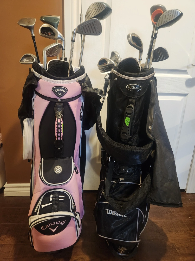Selling a set of golf clubs including a Callaway bag (pink) and a Wilson bag (black). The set includes various irons and woods, including a Callaway Big Bertha.