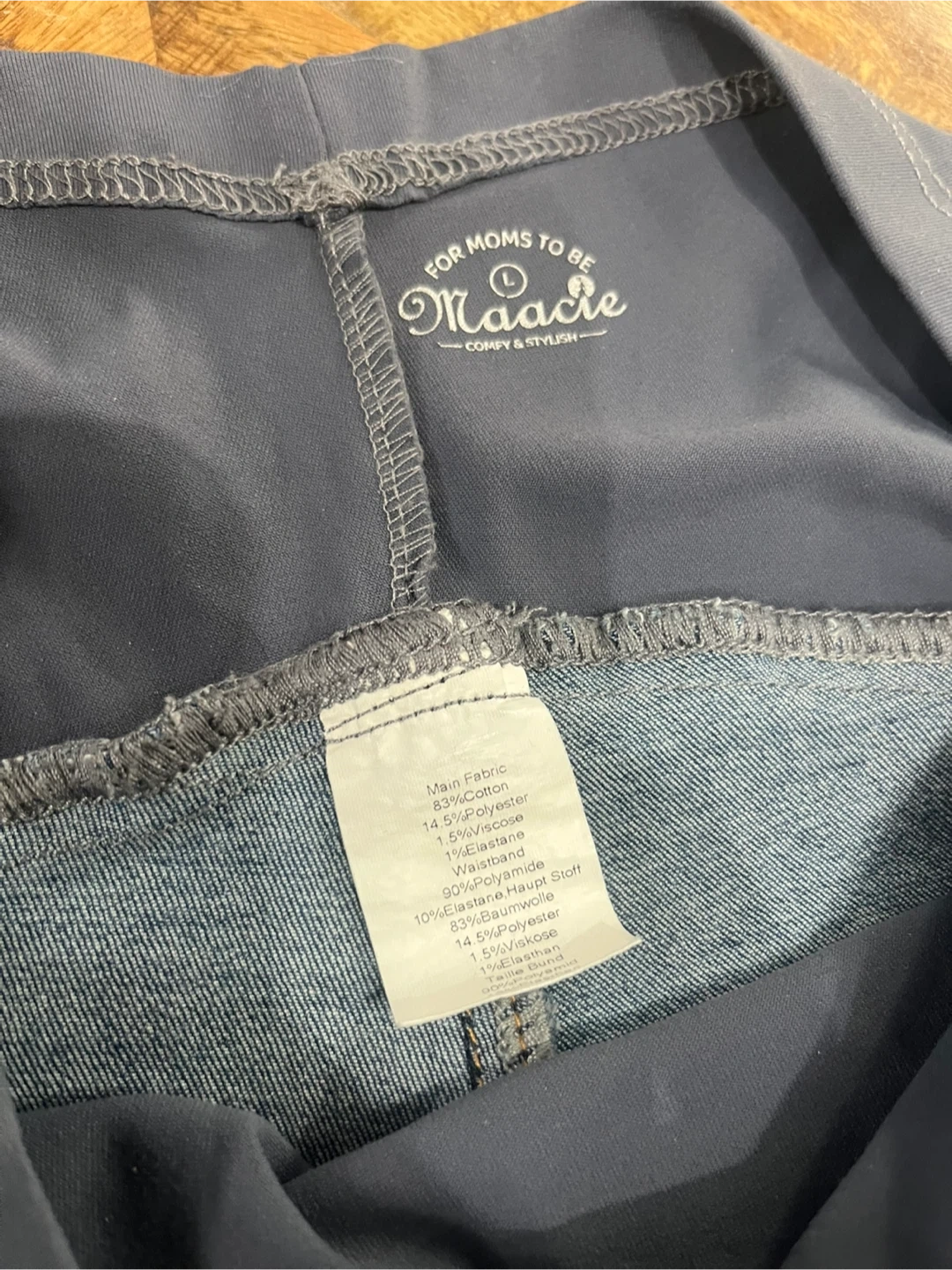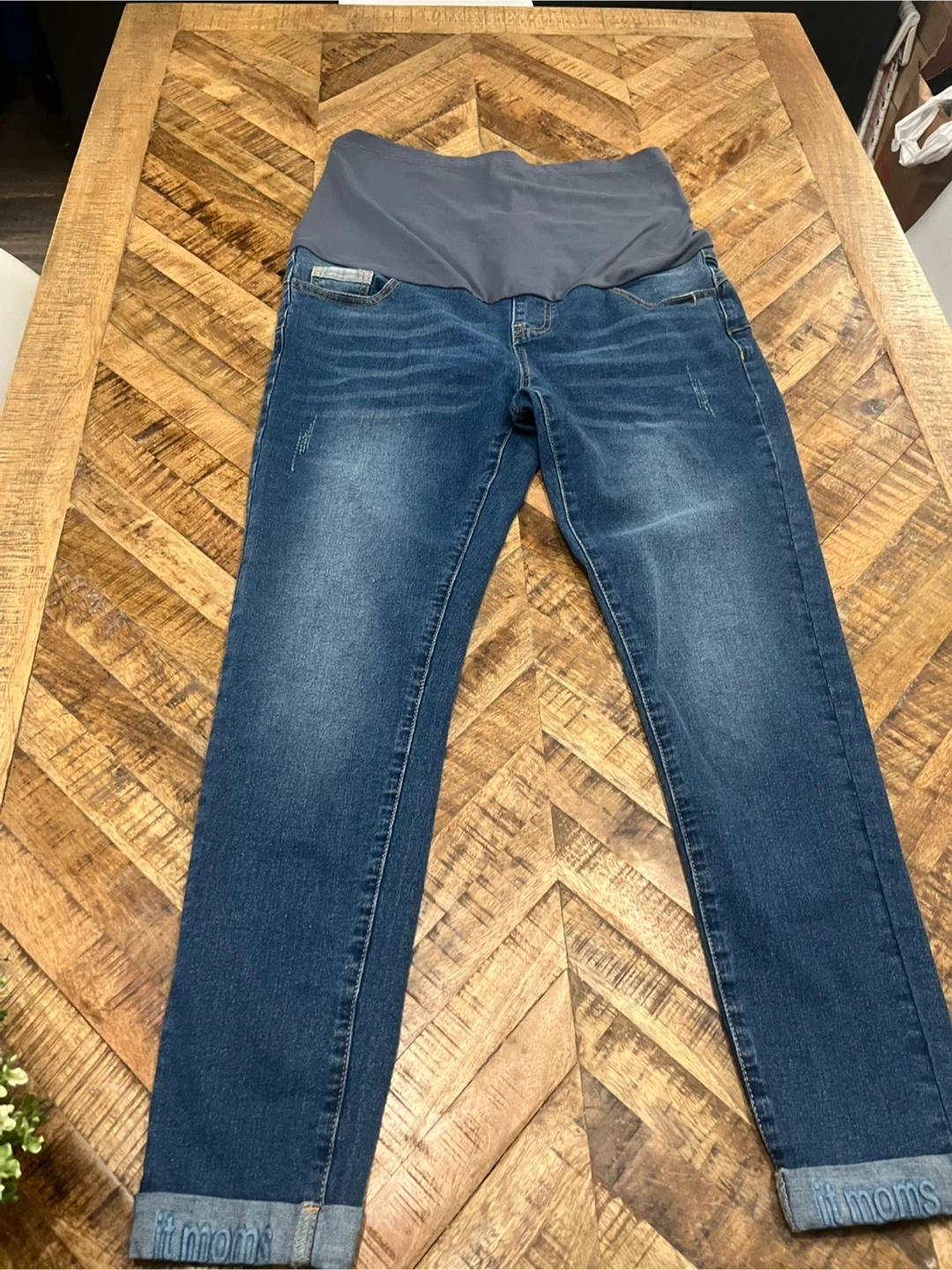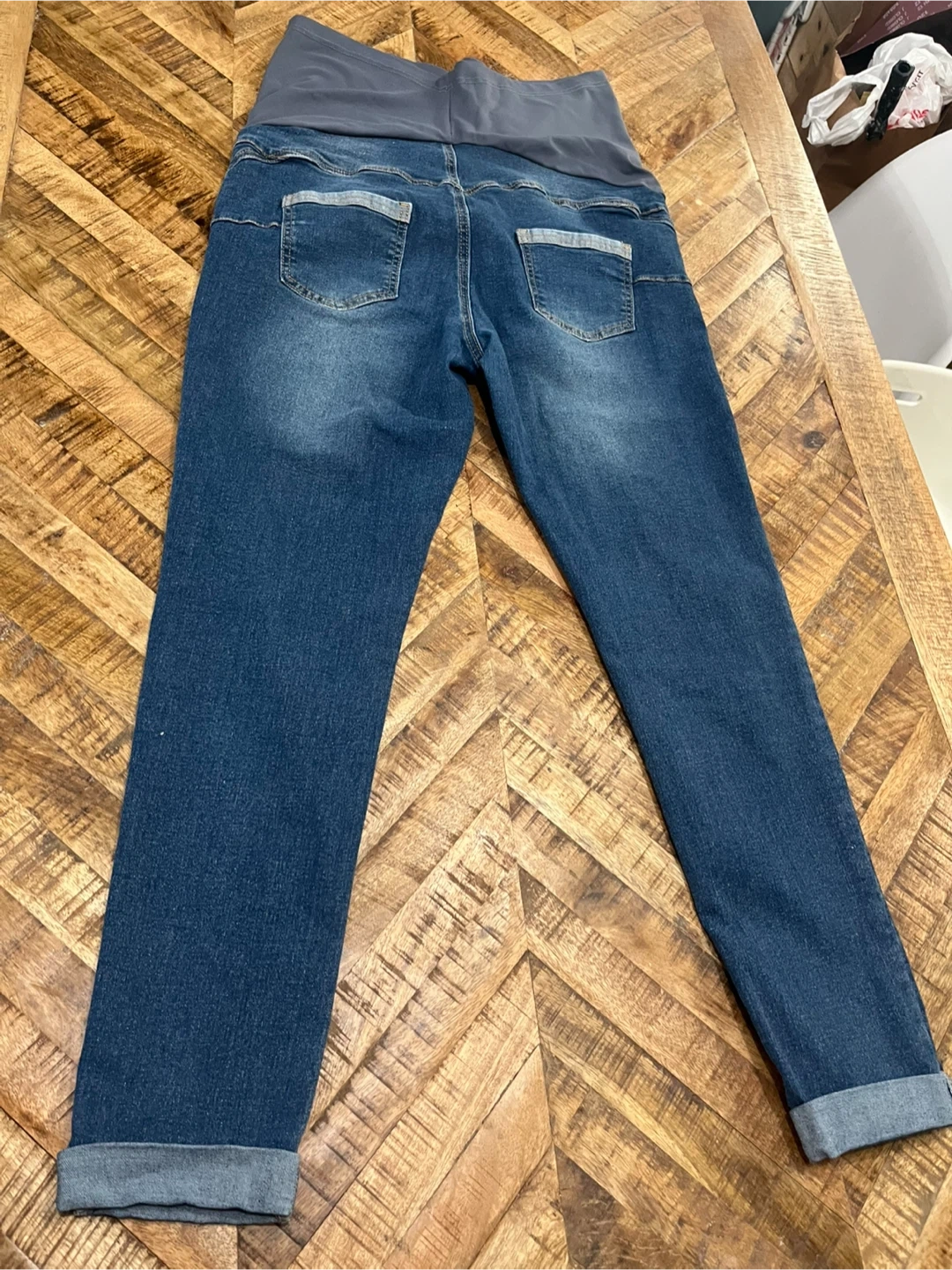 Maacie dark wash maternity jeans. Secret fit stretch. Size Large. Comfortable and stylish. Size Large. From a pet friendly, smoke free home. Porch pickup only!