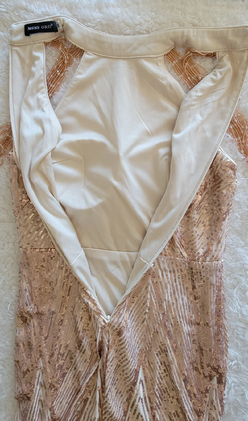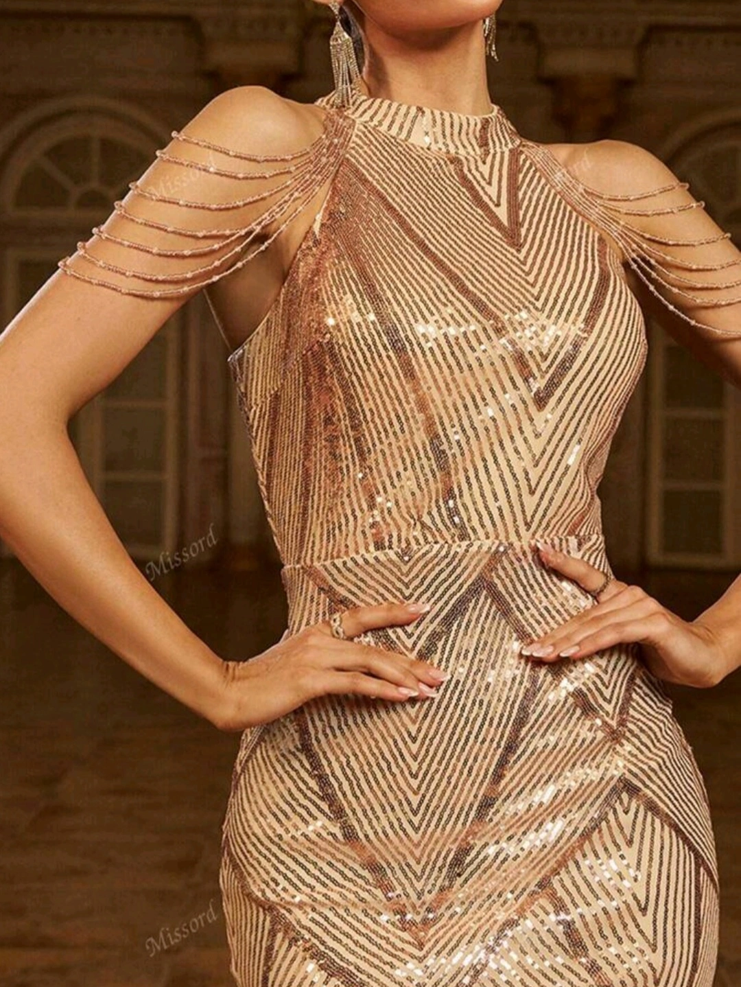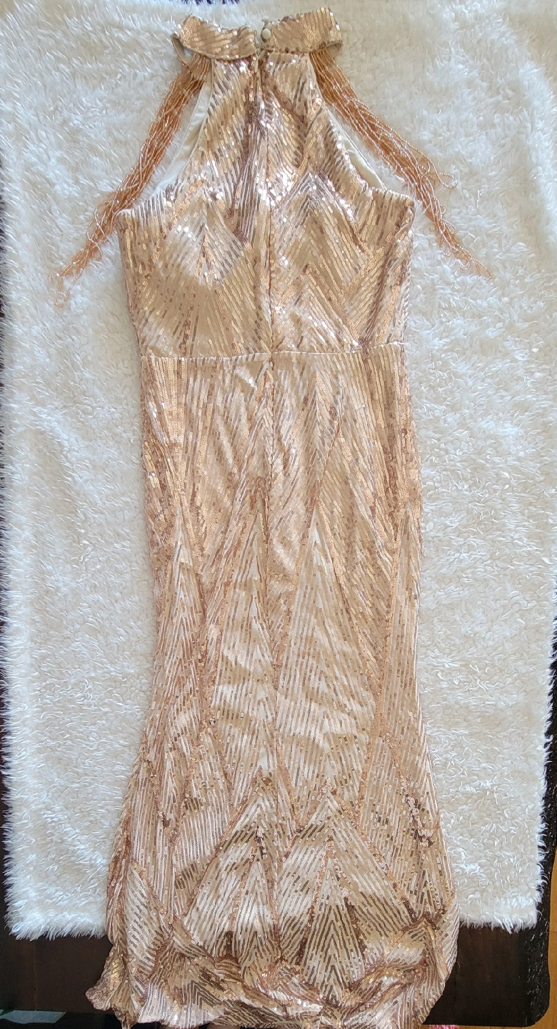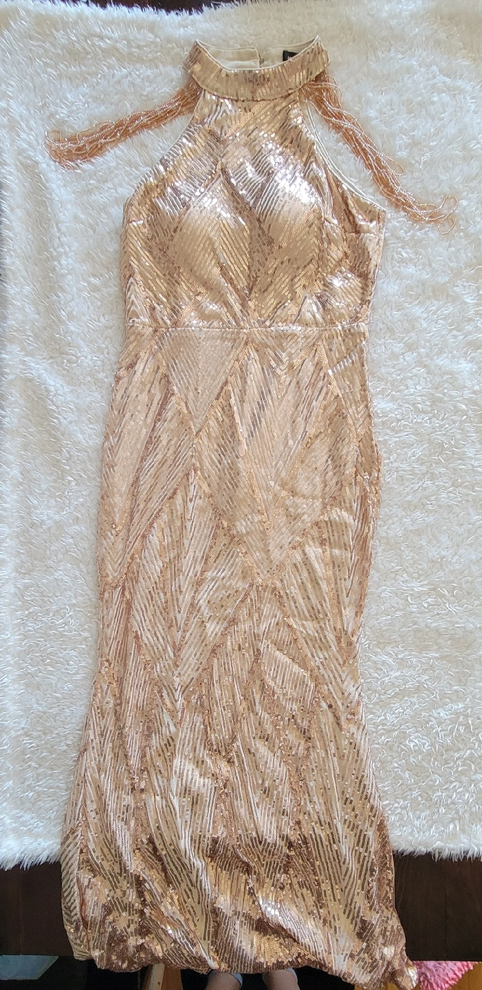 Selling a Halter Neck Sequin Mermaid Prom evening dress in champagne colour. It is a beautiful gown with a unique geometric pattern and beaded shoulder detail. Perfect for a special occasion!