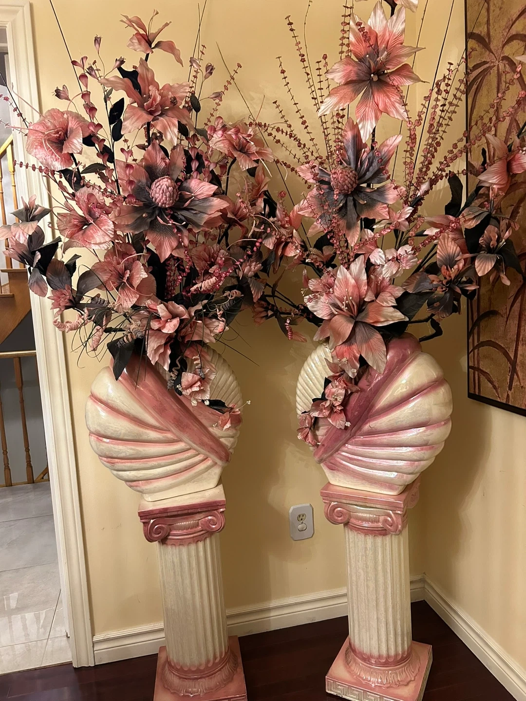 Selling a pair of floral arrangements, each displayed on a decorative stand. These unique pieces add a touch of elegance to any room!