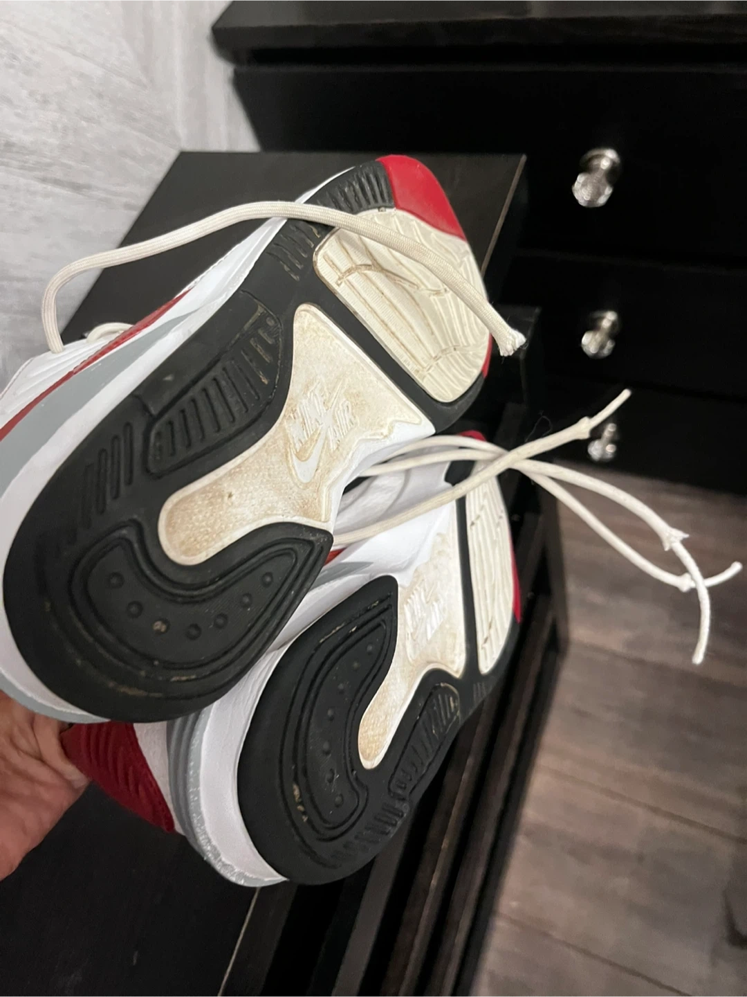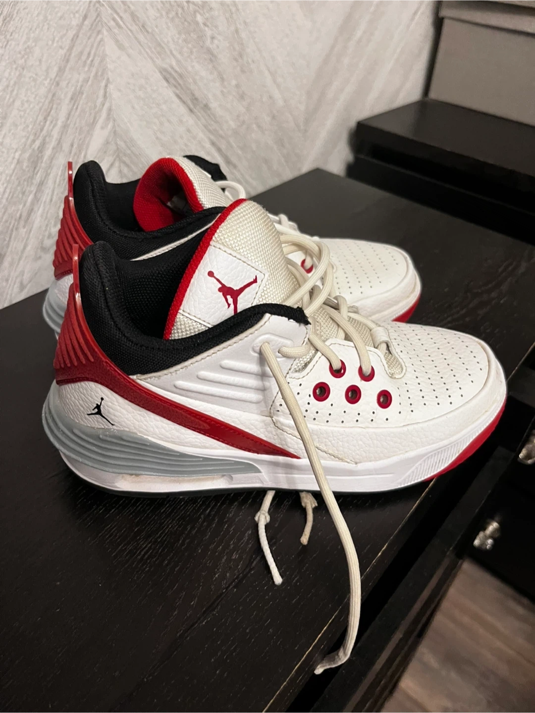 Boys Jordan Max Aura 5 white and university red. Size 4.5 youth. These are in great condition. From a pet friendly, smoke free home. Porch pickup only!