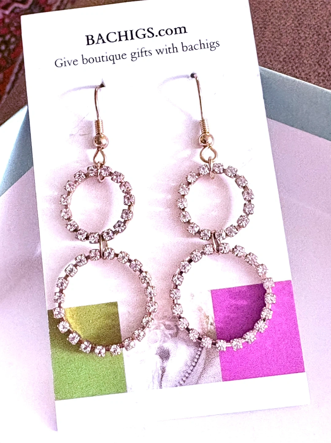 Selling a pair of gold rhinestone circle drop earrings. These earrings feature two rhinestone-studded circles connected by a small link, creating a stylish and eye-catching design. Perfect for adding a touch of sparkle to any outfit!