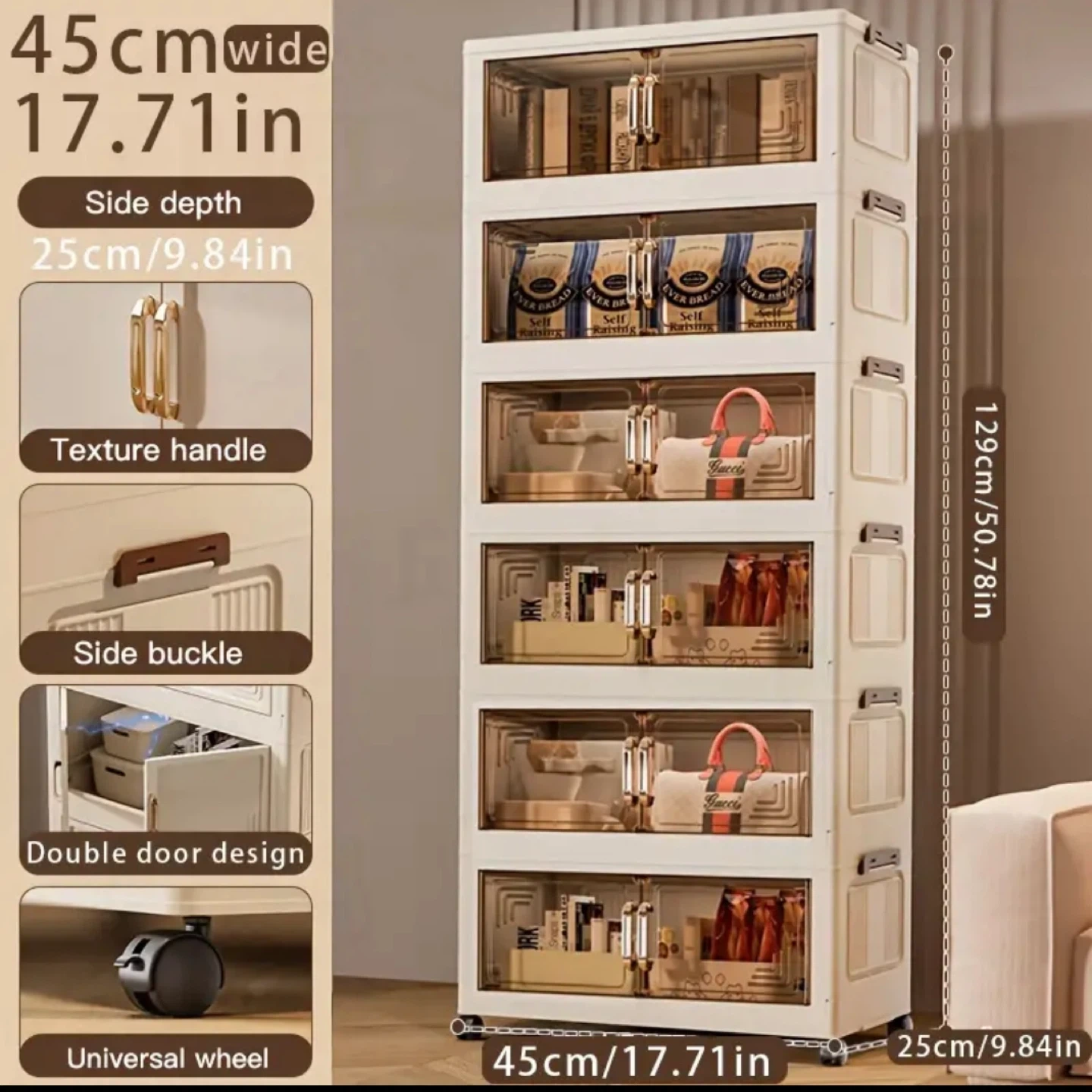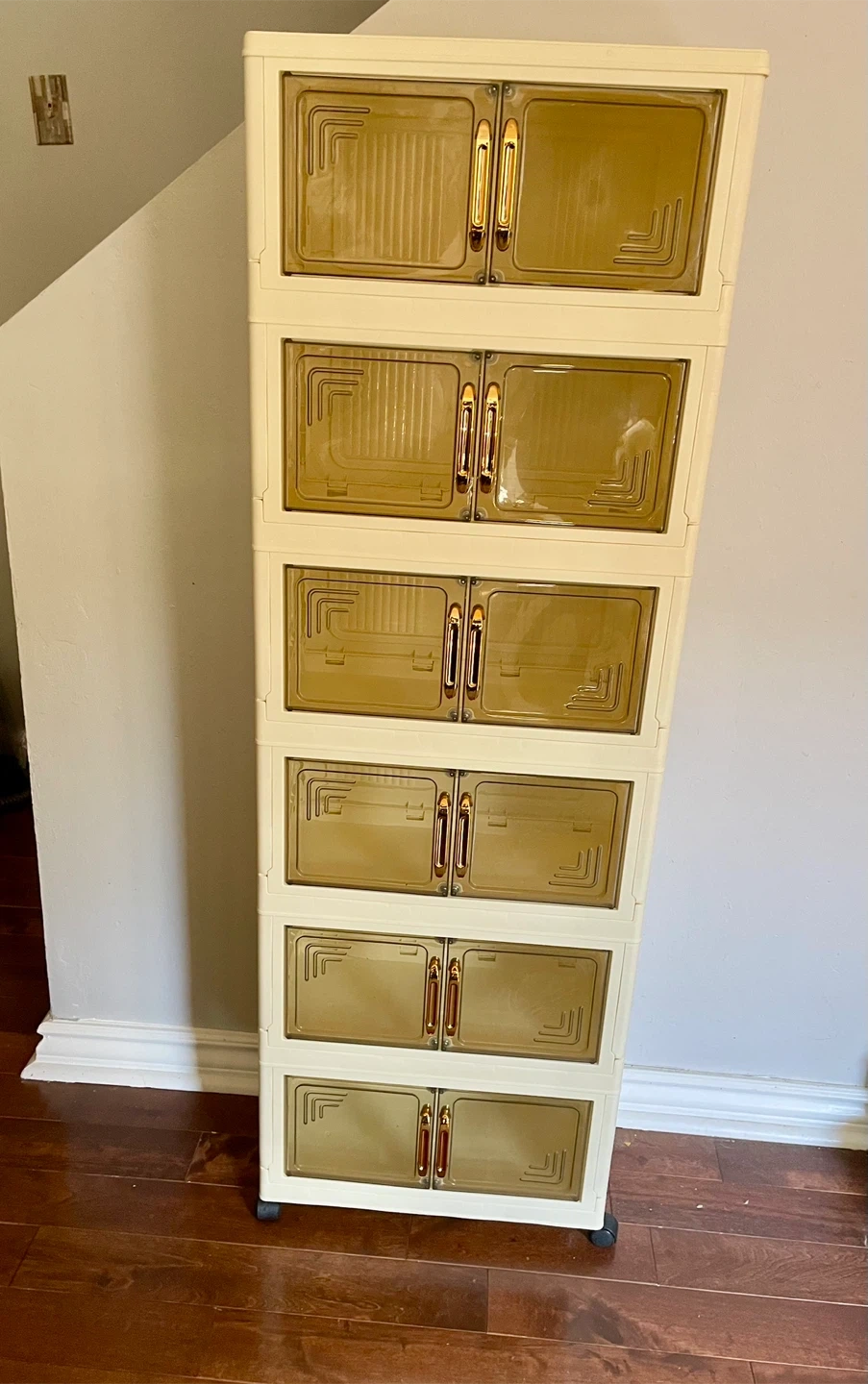 Selling a white, heavy-duty plastic storage cabinet with double doors and golden-toned hinges! It's a multi-tier organizer with top and bottom shelves, designed to save space with its stackable design. Perfect for organizing your kitchen, bathroom, or closet. Easy assembly is required. New in box, unopened bought 2 only needed one