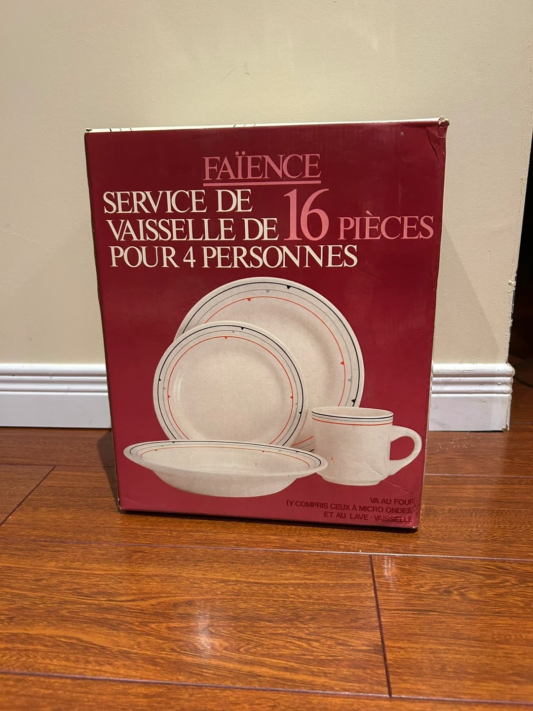 Selling a Faïence dinnerware set, perfect for a family of four! This is a 16-piece set, including plates, bowls, and mugs. It's microwave and dishwasher safe, making it super convenient for everyday use