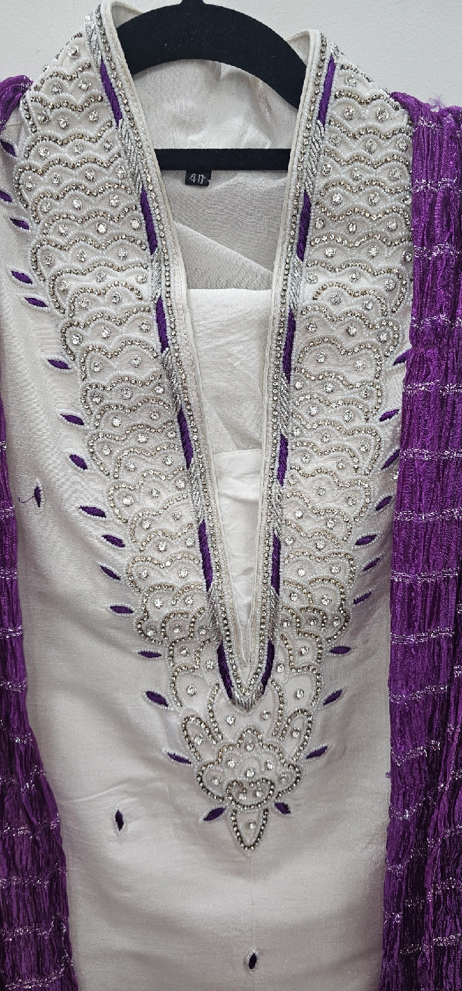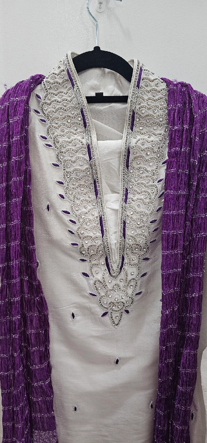 Here's a beautiful salwar kameez set! It features intricate silver and purple embellishments around the neckline and on the sleeves. The set includes a white kurta, matching bottoms, and a purple dupatta. Size 40.