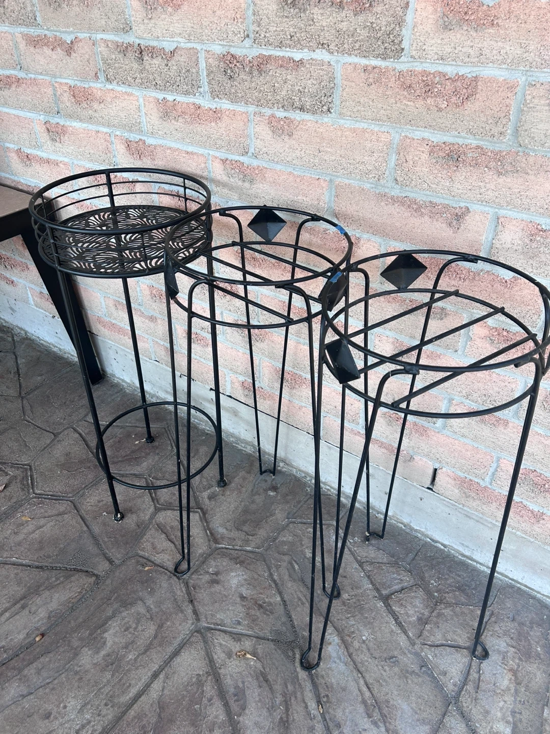 Selling a set of three black metal plant stands. They're in great condition and perfect for adding a touch of greenery to your home or balcony! One of the stands has a solid metal top, while the other two have a diamond design on top