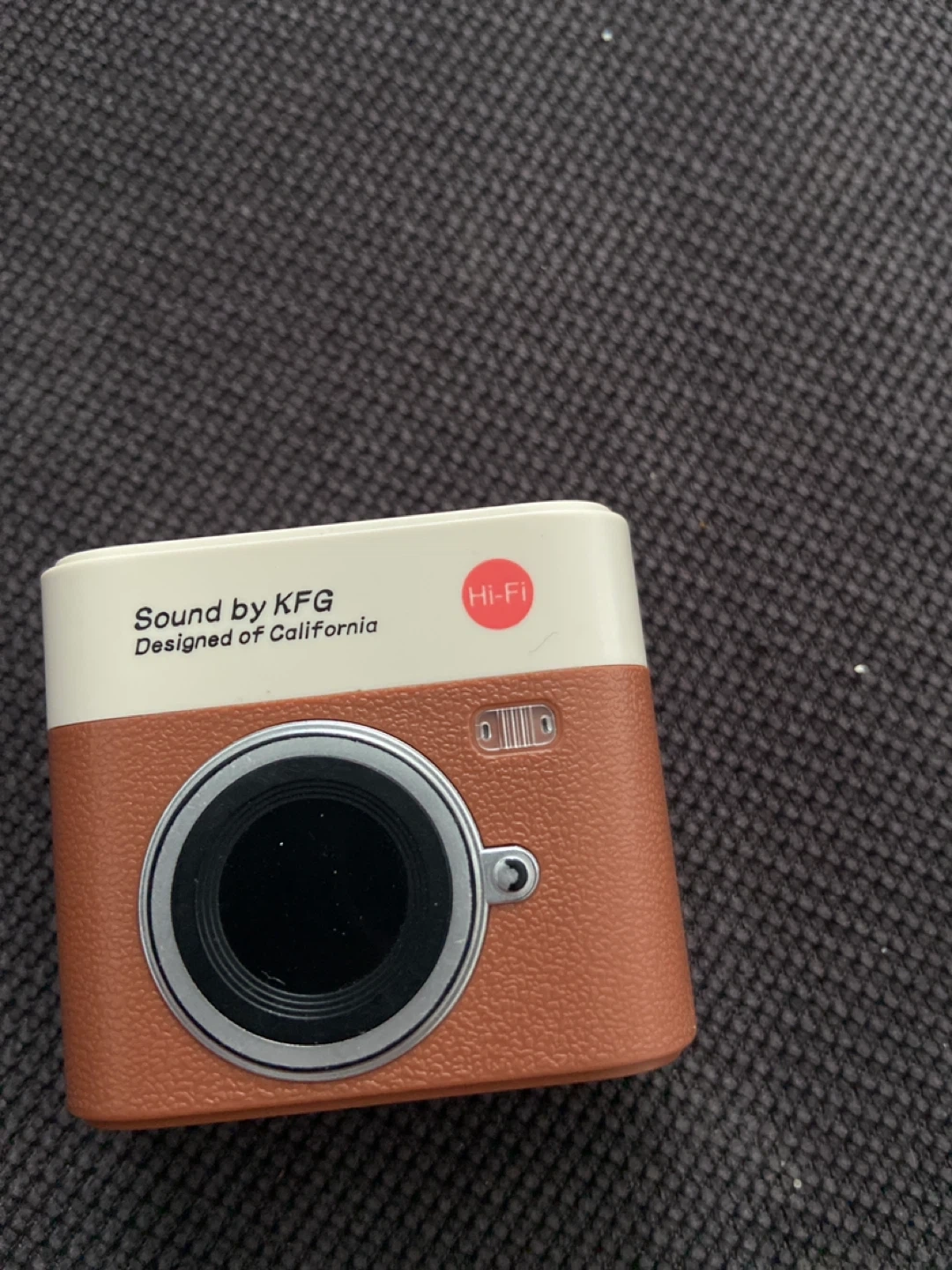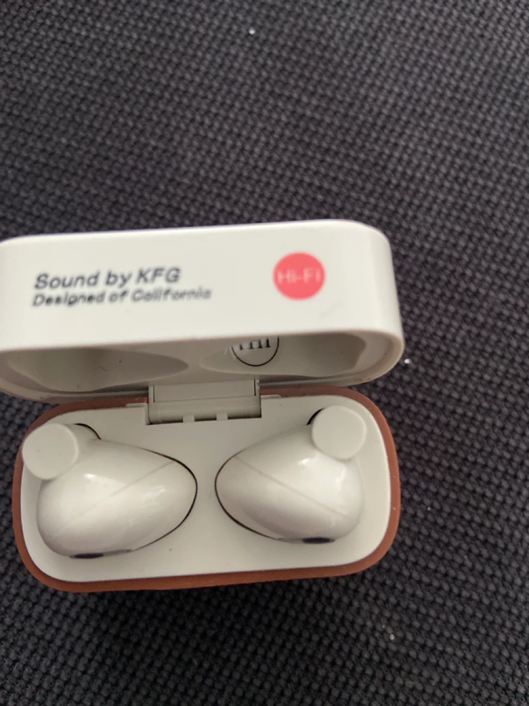 Selling a pair of KFG wireless earbuds in a unique camera-style case! They are designed in California and have a Hi-Fi sound quality. The case has a display showing 84.